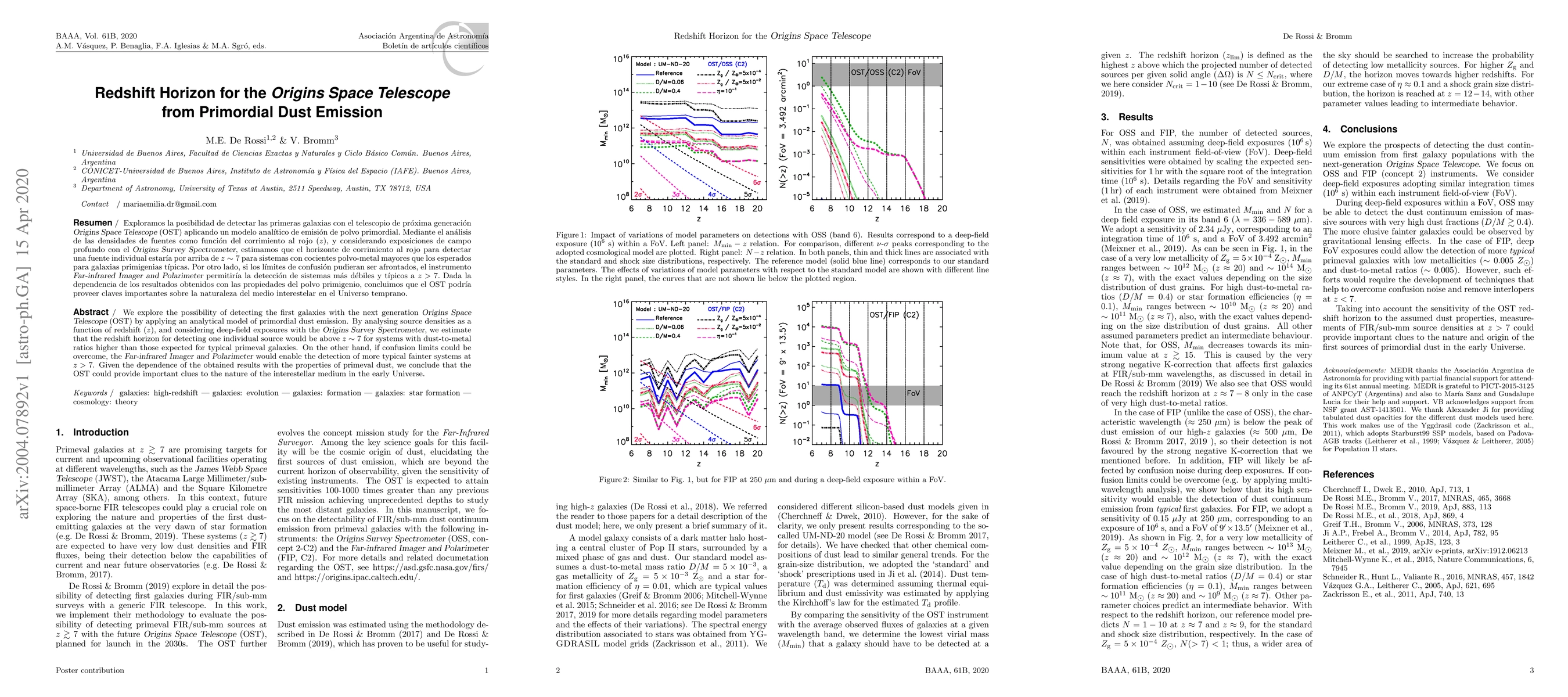 The Origins Space Telescope (OST) may detect first galaxies at redshifts above z~7 using an analytical model of primordial dust emission, though detection depends on dust-to-metal ratios. If confusion limits are overcome, the Far-infrared Imager and Polarimeter could detect fainter systems at z>7, offering insights into the early Universe's interstellar medium.