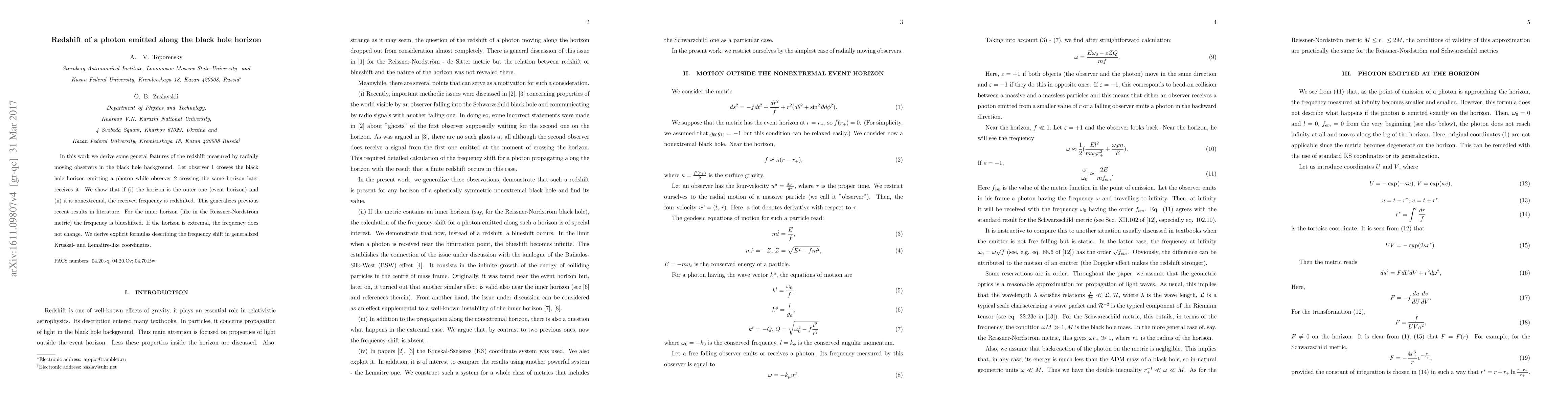 The paper derives general features of redshift for photons emitted along the black hole horizon, considering radially moving observers and different types of horizons (outer, inner, and extremal).