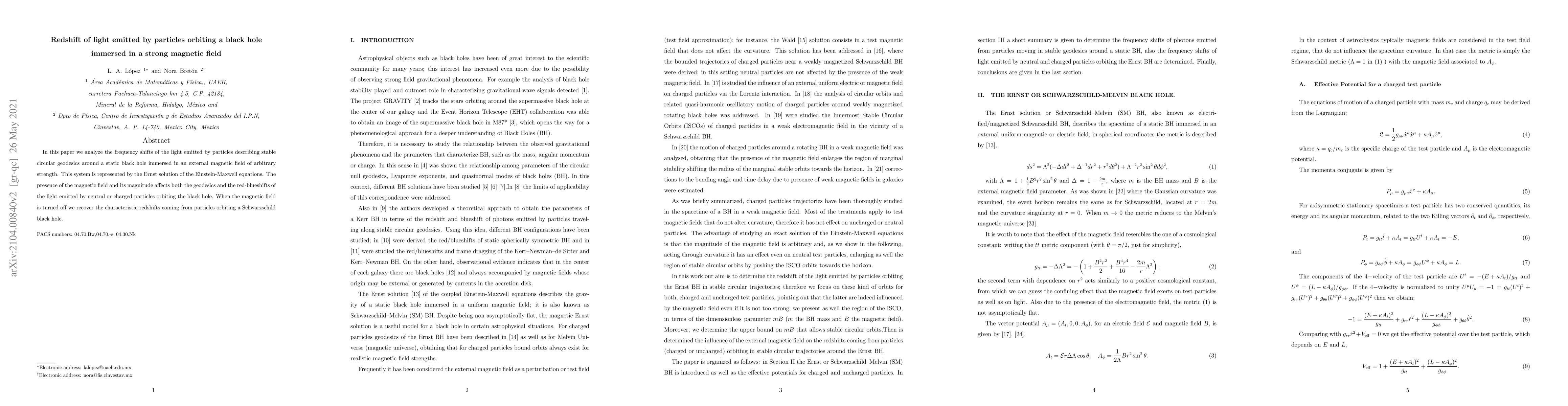 This paper investigates the frequency shifts of light emitted by particles in stable circular orbits around a static black hole immersed in a strong magnetic field, represented by the Ernst solution. The magnetic field influences both the particle orbits and the red-blueshifts of emitted light, with effects reverting to Schwarzschild black hole characteristics when the field is absent.