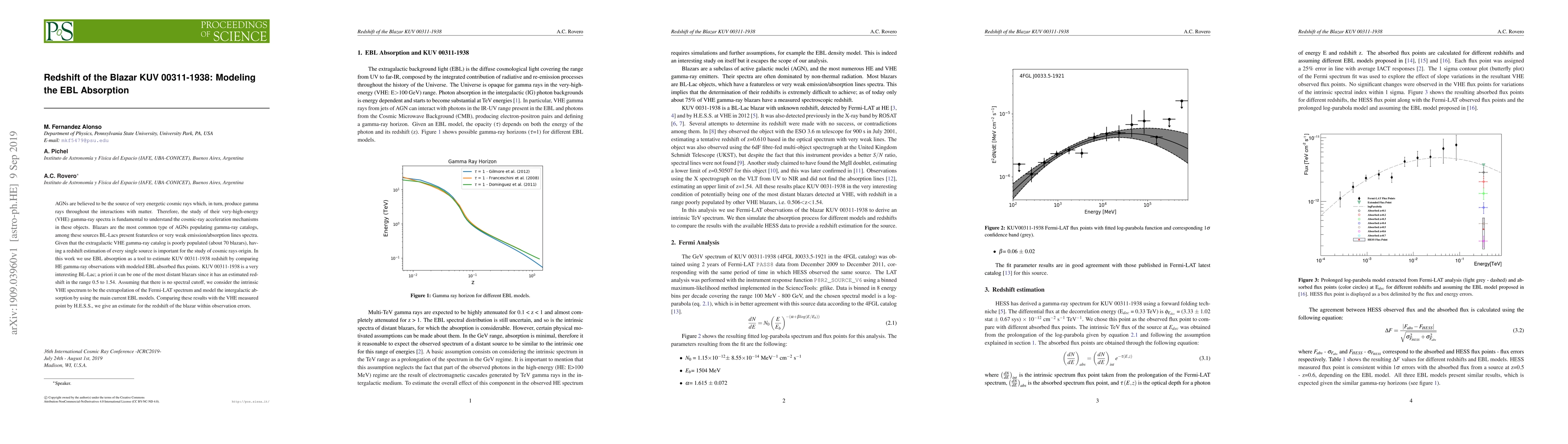 This study estimates the redshift of the blazar KUV 00311-1938 using extragalactic background light (EBL) absorption modeling. By comparing high-energy gamma-ray observations from Fermi-LAT with modeled EBL-absorbed flux points, and correlating with VHE measurements from H.E.S.S., the researchers provide a redshift estimate for KUV 00311-1938. This blazar, potentially one of the most distant, is a BL-Lac object with an estimated redshift between 0.5 and 1.54. The methodology focuses on intrinsic VHE spectrum extrapolation from Fermi-LAT data and intergalactic absorption modeling via current EBL models.