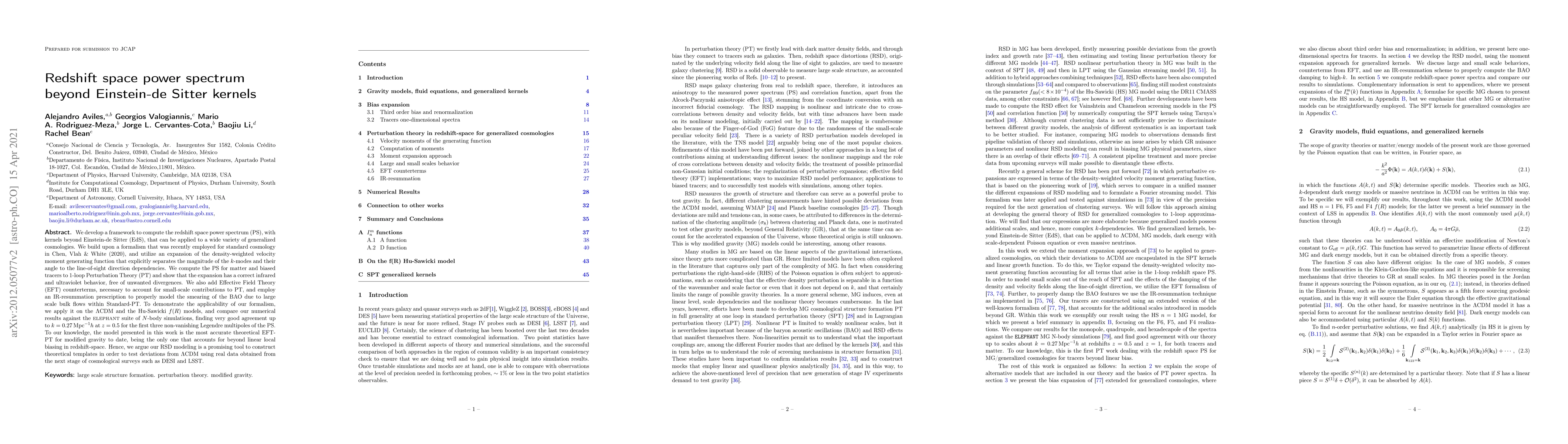 The paper's main technical contribution is a comprehensive framework for computing the redshift space power spectrum with kernels beyond EdS, applicable to generalized cosmologies, including ΛCDM, massive neutrinos, modified gravity models, and dark energy sourced by a non-trivial scale-dependent Poisson equation.