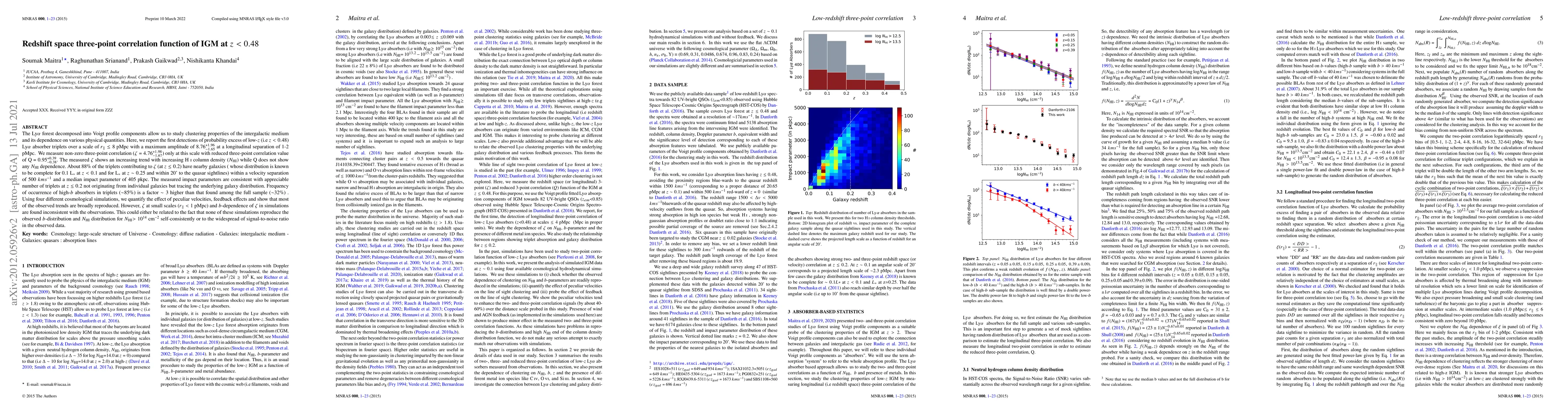 The Ly$\alpha$ forest decomposed into Voigt profile components allow us to study clustering properties of the intergalactic medium and its dependence on various physical quantities. Here, we report the first detections of probability excess of low-z (i.e z<0.48) Ly$\alpha$ absorber triplets over a scale of $r_\parallel\leq8$pMpc with a maximum amplitude of $8.76^{+1.96}_{-1.65}$ at a longitudinal separation of 1-2pMpc. We measure non-zero three-point correlation ($\zeta=4.76^{+1.98}_{-1.67}$) only at this scale with reduced three-point correlation value of Q=$0.95^{+0.39}_{-0.38}$. The measured $\zeta$ shows an increasing trend with increasing HI column density ($N_{HI}$) while Q does not show any $N_{HI}$ dependence. About 88% of the triplets contributing to $\zeta$ (at z$\le0.2$) have nearby galaxies (whose distribution is known to be complete for 0.1L$_*$ at z<0.1 and for L$_*$ at z~0.25 and within 20' to the quasar sightlines) within a velocity separation of 500$kms^{-1}$ and a median impact parameter of 405pkpc. The measured impact parameters are consistent with appreciable number of triplets at z$\le0.2$ not originating from individual galaxies but tracing the underlying galaxy distribution. Frequency of occurrence of high-b absorbers in triplets (~85%) is a factor~3 higher than that found among the full sample (~32%). Using four different cosmological simulations, we quantify the effect of peculiar velocities, feedback effects and show that most of the observed trends are broadly reproduced. However, $\zeta$ at small scales ($r_\parallel<1$pMpc) and b-dependence of $\zeta$ in simulations are found inconsistent with the observations. This could either be related to the fact that none of these simulations reproduce the observed b-distribution and $N_{HI}$ distribution for $N_{HI}>10^{14}$cm$^{-2}$ self-consistently or to the widespread of signal-to-noise ratio in the observed data.