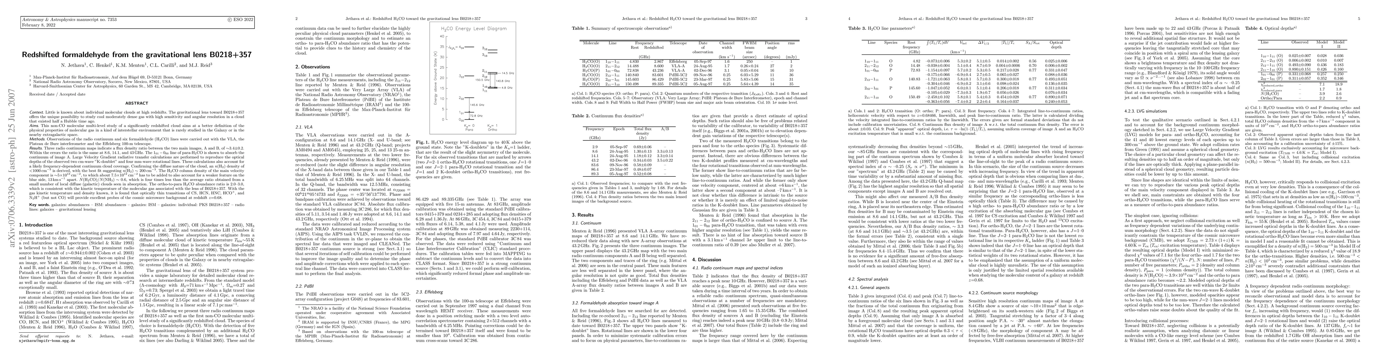 The gravitational lens toward B0218+357 offers the unique possibility to study cool moderately dense gas with high sensitivity and angular resolution in a cloud that existed half a Hubble time ago. Observations of the radio continuum and six formaldehyde (H2CO) lines were carried out with the VLA, the Plateau de Bure interferometer, and the Effelsberg 100-m telescope. Three radio continuum maps indicate a flux density ratio between the two main images, A and B, of ~ 3.4 +/- 0.2. Within the errors the ratio is the same at 8.6, 14.1, and 43 GHz. The 1_{01}-0_{00} line of para-H2CO is shown to absorb the continuum of image A. Large Velocity Gradient radiative transfer calculations are performed to reproduce the optical depths of the observed two cm-wave "K-doublet" and four mm-wave rotational lines. These calculations also account for a likely frequency-dependent continuum cloud coverage. Confirming the diffuse nature of the cloud, an n(H2) density of < 1000 cm^{-3} is derived, with the best fit suggesting n(H2) ~ 200 cm^{-3}. The H2CO column density of the main velocity component is ~5 * 10^{13} cm^{-2}, to which about 7.5 * 10^{12} cm^{-2} has to be added to also account for a weaker feature on the blue side, 13 km/s apart. N(H2CO)/N(NH3) ~ 0.6, which is four times less than the average ratio obtained from a small number of local diffuse (galactic) clouds seen in absorption. The ortho-to-para H2CO abundance ratio is 2.0 - 3.0, which is consistent with the kinetic temperature of the molecular gas associated with the lens of B0218+357. With the gas kinetic temperature and density known, it is found that optically thin transitions of CS, HCN, HNC, HCO+, and N2H+ (but not CO) will provide excellent probes of the cosmic microwave background at redshift z=0.68.