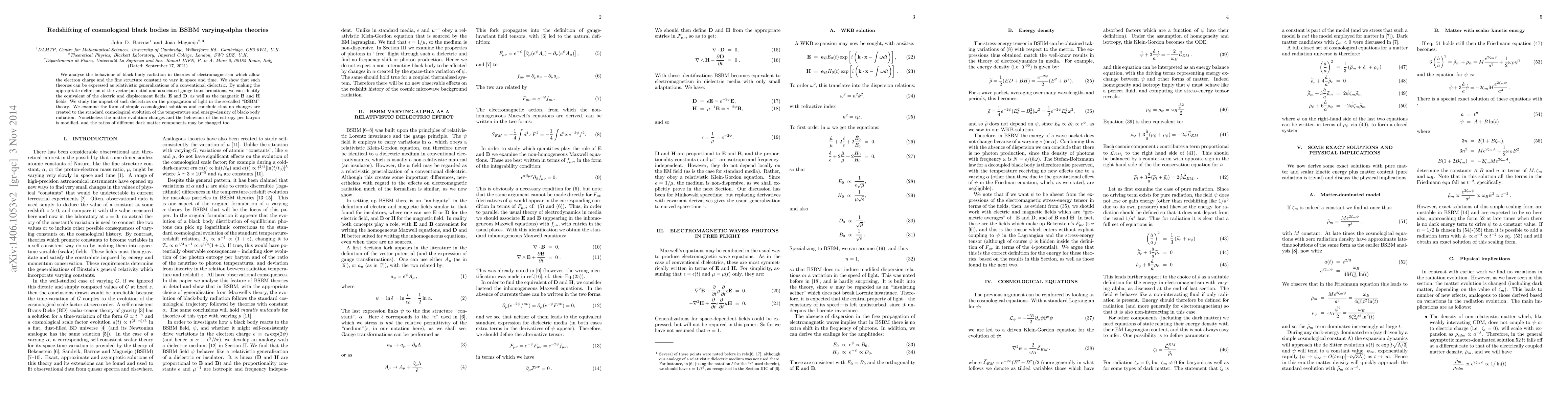 We analyse the behaviour of black-body radiation in theories of electromagnetism which allow the electron charge and the fine structure constant to vary in space and time. We show that such theories can be expressed as relativistic generalizations of a conventional dielectric. By making the appropriate definition of the vector potential and associated gauge transformations, we can identify the equivalent of the electric and displacement fields, $\mathbf{E}$ and $\mathbf{D}$, as well as the magnetic $ \mathbf{B}$ and $\mathbf{H}$ fields. We study the impact of such dielectrics on the propagation of light in the so-called BSBM theory and conclude that no changes are created to the standard cosmological evolution of the temperature and energy-density of black-body radiation.