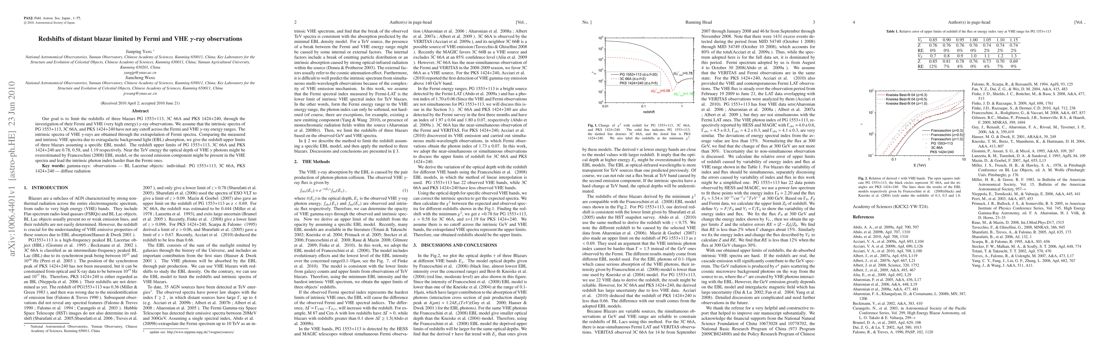 This study limits the redshifts of three blazars using Fermi and VHE $\gamma$-ray observations, finding upper limits of 0.78, 0.58, and 1.19 for PG 1553+113, 3C 66A, and PKS 1424+240 respectively, while noting potential overestimations in the optical depth of VHE $\gamma$ photons by the Franceschini (2008) EBL model.