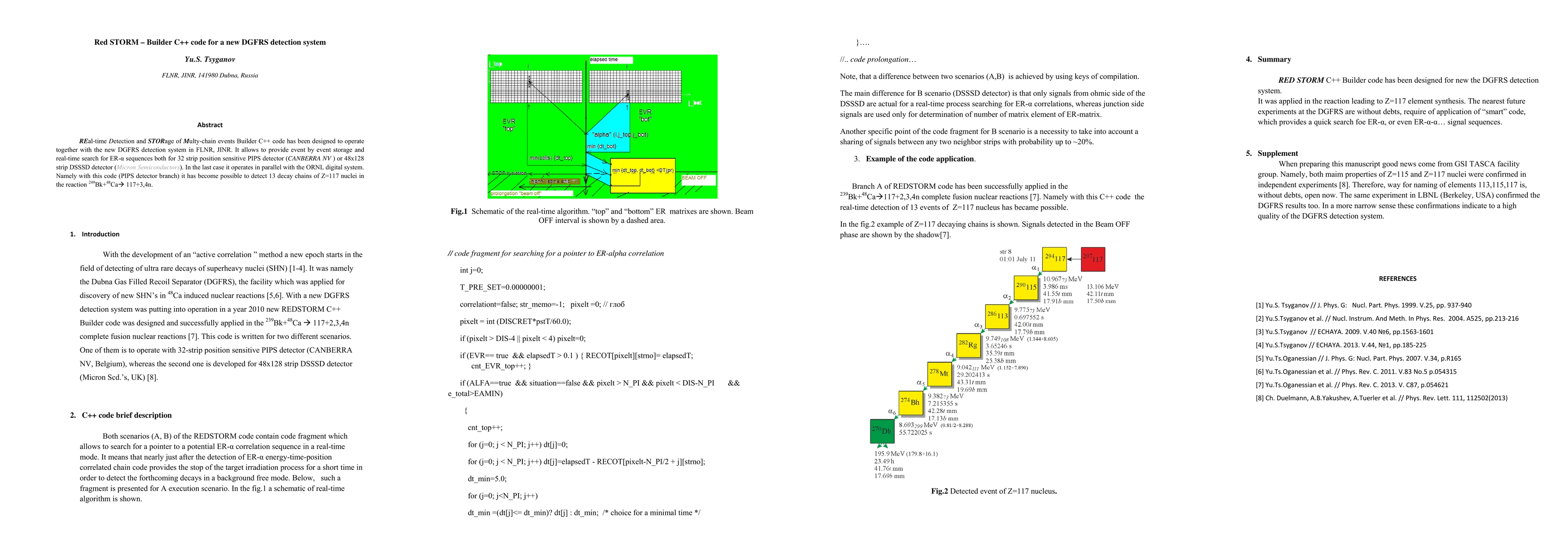 REal-time Detection and STORage of Multy-chain events Builder C++ code has been designed to operate together with the new DGFRS detection system in FLNR, JINR. It allows to provide event by event storage and real-time search for ER-alpha sequences both for 32 strip position sensitive PIPS detector (CANBERRA NV) or 48x128 strip DSSSD detector (Micron Semiconductors). In the last case it operates in parallel with the ORNL digital system. Namely with this code (PIPS detector branch) it has become possible to detect 13 decay chains of Z=117 nuclei in the reaction 249Bk+48Ca-> 117+3,4n.