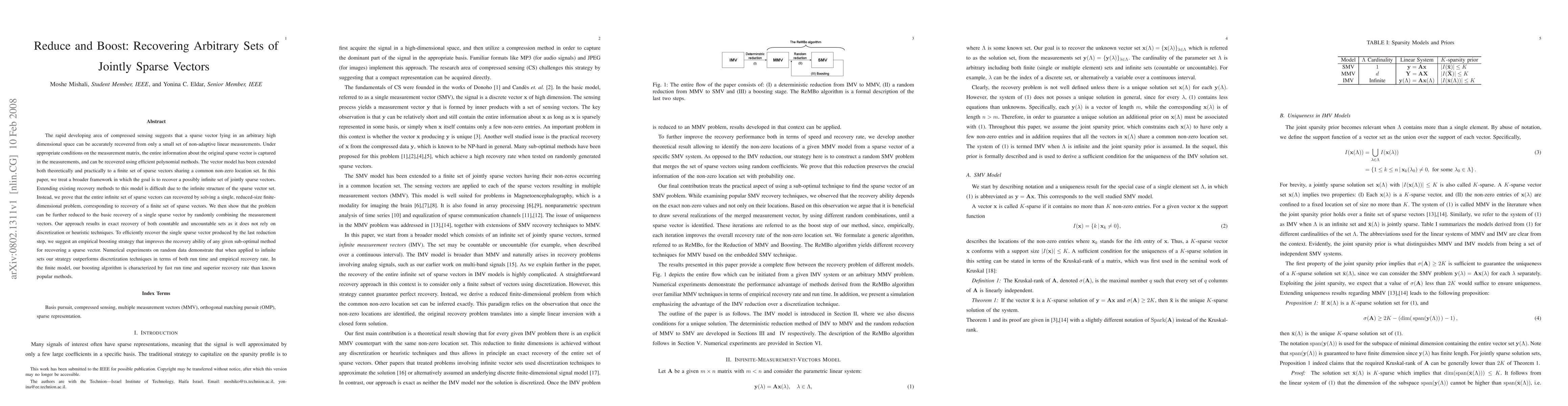 The rapid developing area of compressed sensing suggests that a sparse vector lying in an arbitrary high dimensional space can be accurately recovered from only a small set of non-adaptive linear measurements. Under appropriate conditions on the measurement matrix, the entire information about the original sparse vector is captured in the measurements, and can be recovered using efficient polynomial methods. The vector model has been extended to a finite set of sparse vectors sharing a common non-zero location set. In this paper, we treat a broader framework in which the goal is to recover a possibly infinite set of jointly sparse vectors. Extending existing recovery methods to this model is difficult due to the infinite structure of the sparse vector set. Instead, we prove that the entire infinite set of sparse vectors can recovered by solving a single, reduced-size finite-dimensional problem, corresponding to recovery of a finite set of sparse vectors. We then show that the problem can be further reduced to the basic recovery of a single sparse vector by randomly combining the measurement vectors. Our approach results in exact recovery of both countable and uncountable sets as it does not rely on discretization or heuristic techniques. To efficiently recover the single sparse vector produced by the last reduction step, we suggest an empirical boosting strategy that improves the recovery ability of any given sub-optimal method for recovering a sparse vector. Numerical experiments on random data demonstrate that when applied to infinite sets our strategy outperforms discretization techniques in terms of both run time and empirical recovery rate. In the finite model, our boosting algorithm is characterized by fast run time and superior recovery rate than known popular methods.