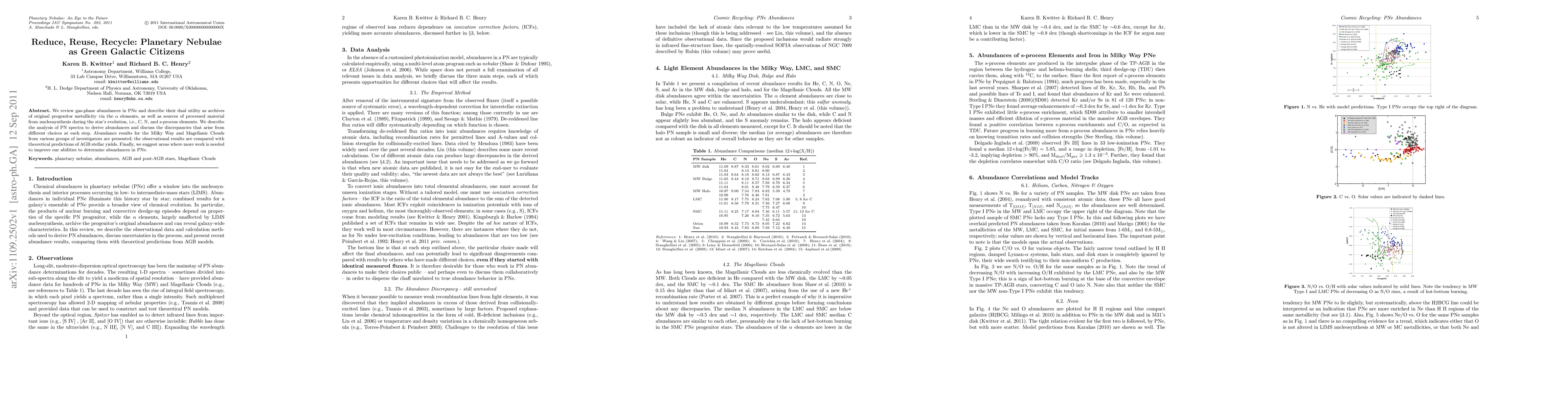We review gas-phase abundances in PNe and describe their dual utility as archives of original progenitor metallicity via the alpha elements, as well as sources of processed material from nucleosynthesis during the star's evolution, i.e., C, N, and s-process elements. We describe the analysis of PN spectra to derive abundances and discuss the discrepancies that arise from different choices at each step. Abundance results for the Milky Way and Magellanic Clouds from various groups of investigators are presented; the observational results are compared with theoretical predictions of AGB stellar yields. Finally, we suggest areas where more work is needed to improve our abilities to determine abundances in PNe.