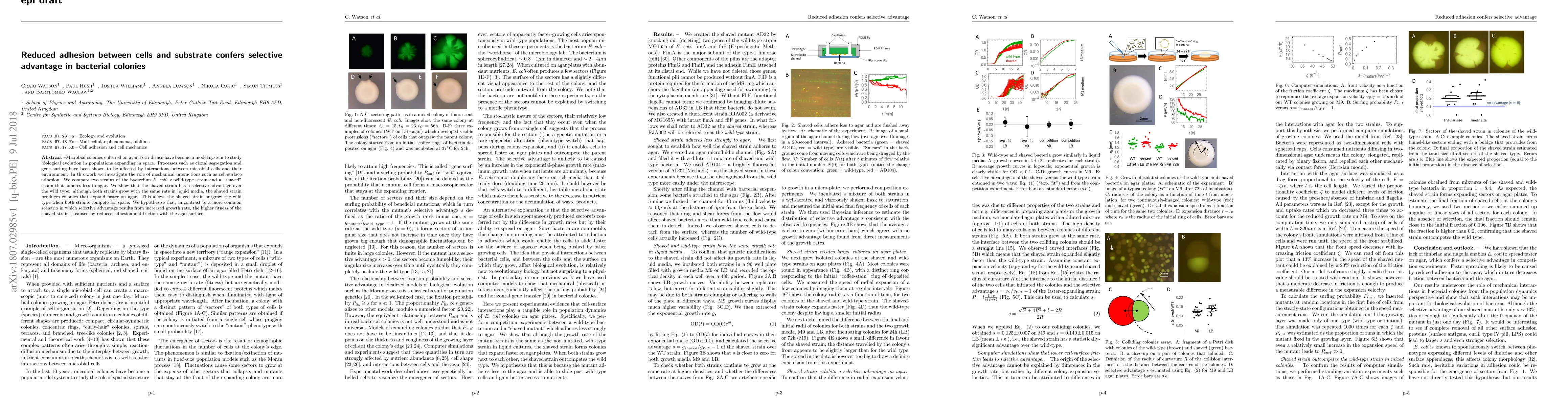 Microbial colonies cultured on agar Petri dishes have become a model system to study biological evolution in populations expanding in space. Processes such as clonal segregation and gene surfing have been shown to be affected by interactions between microbial cells and their environment. In this work we investigate the role of mechanical interactions such as cell-surface adhesion. We compare two strains of the bacterium E. coli: a wild-type strain and a "shaved" strain that adheres less to agar. We show that the shaved strain has a selective advantage over the wild type: although both strains grow with the same rate in liquid media, the shaved strain produces colonies that expand faster on agar. This allows the shaved strain outgrow the wild type when both strains compete for space. We hypothesise that, in contrast to a more common scenario in which selective advantage results from increased growth rate, the higher fitness of the shaved strain is caused by reduced adhesion and friction with the agar surface.