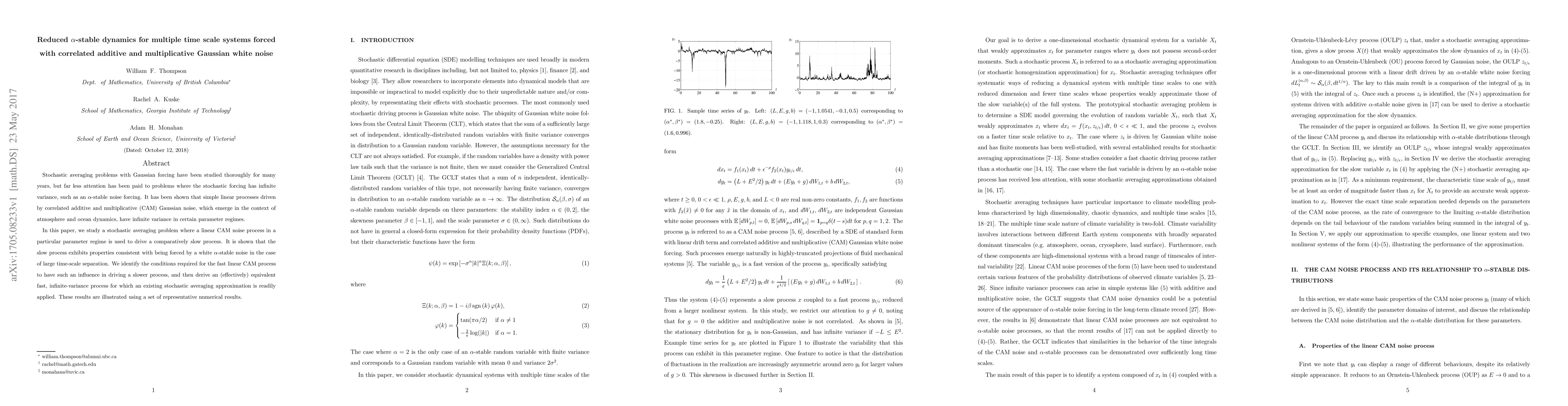 Stochastic averaging problems with Gaussian forcing have been studied thoroughly for many years, but far less attention has been paid to problems where the stochastic forcing has infinite variance, such as an {\alpha}-stable noise forcing. It has been shown that simple linear processes driven by correlated additive and multiplicative (CAM) Gaussian noise, which emerge in the context of atmosphere and ocean dynamics, have infinite variance in certain parameter regimes. In this paper, we study a stochastic averaging problem where a linear CAM noise process in a particular parameter regime is used to drive a comparatively slow process. It is shown that the slow process exhibits properties consistent with being forced by a white {\alpha}-stable noise in the case of large time-scale separation. We identify the conditions required for the fast linear CAM process to have such an influence in driving a slower process, and then derive an (effectively) equivalent fast, infinite-variance process for which an existing stochastic averaging approximation is readily applied. These results are illustrated using a set of representative numerical results.