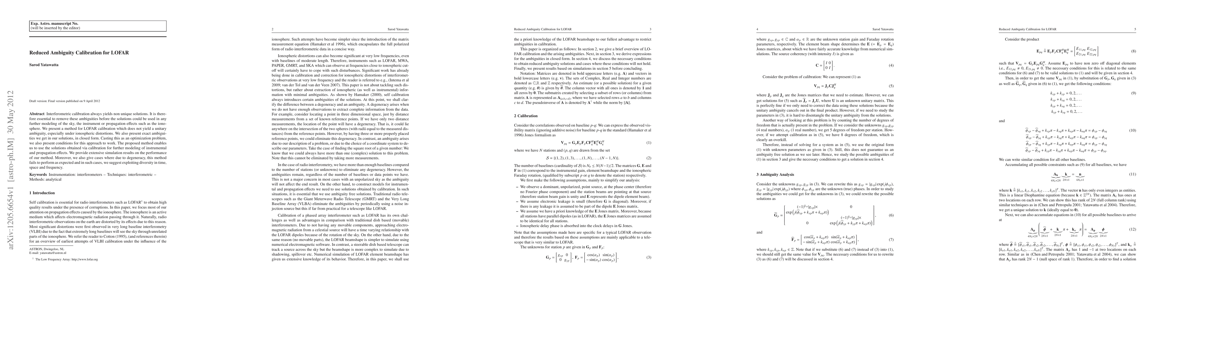 Interferometric calibration always yields non unique solutions. It is therefore essential to remove these ambiguities before the solutions could be used in any further modeling of the sky, the instrument or propagation effects such as the ionosphere. We present a method for LOFAR calibration which does not yield a unitary ambiguity, especially under ionospheric distortions. We also present exact ambiguities we get in our solutions, in closed form. Casting this as an optimization problem, we also present conditions for this approach to work. The proposed method enables us to use the solutions obtained via calibration for further modeling of instrumental and propagation effects. We provide extensive simulation results on the performance of our method. Moreover, we also give cases where due to degeneracy, this method fails to perform as expected and in such cases, we suggest exploiting diversity in time, space and frequency.