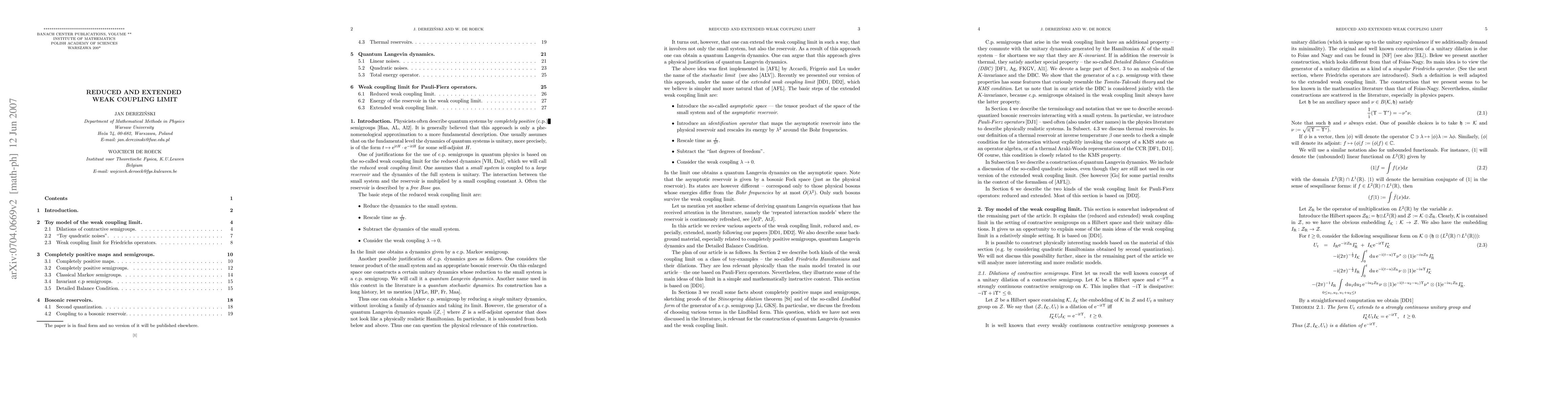 We give an extended review of recent work on the extended weak coupling limit. Background material on completely positive semigroups and their unitary dilations is given, as well as a particularly easy construction of `quadratic noises'.