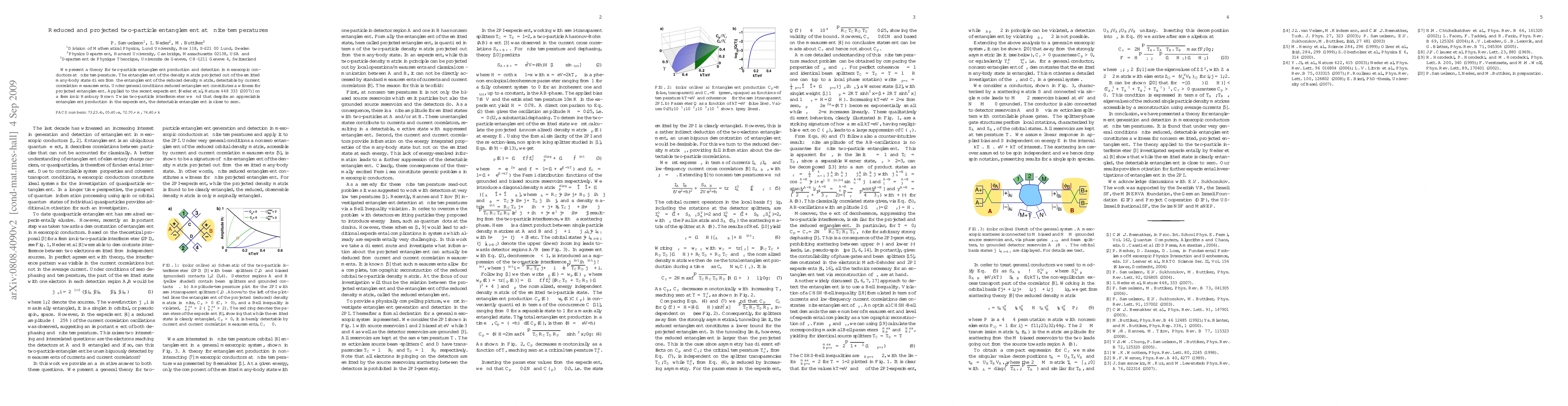 This paper develops a theory for two-particle entanglement in mesoscopic conductors at finite temperatures, showing that reduced entanglement provides a lower bound for projected entanglement. Despite significant entanglement production in a recent experiment, detectable entanglement remains near zero.