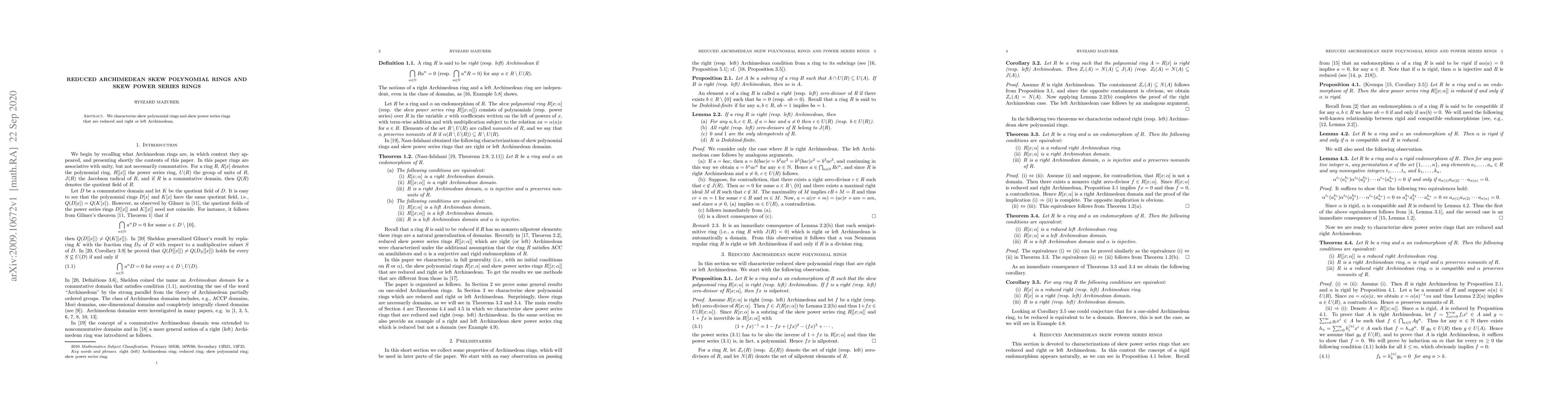 Summary: The paper identifies conditions for skew polynomial rings and skew power series rings to be reduced and Archimedean, focusing on their structural properties. These characterizations help understand their behavior and applications in algebraic contexts.