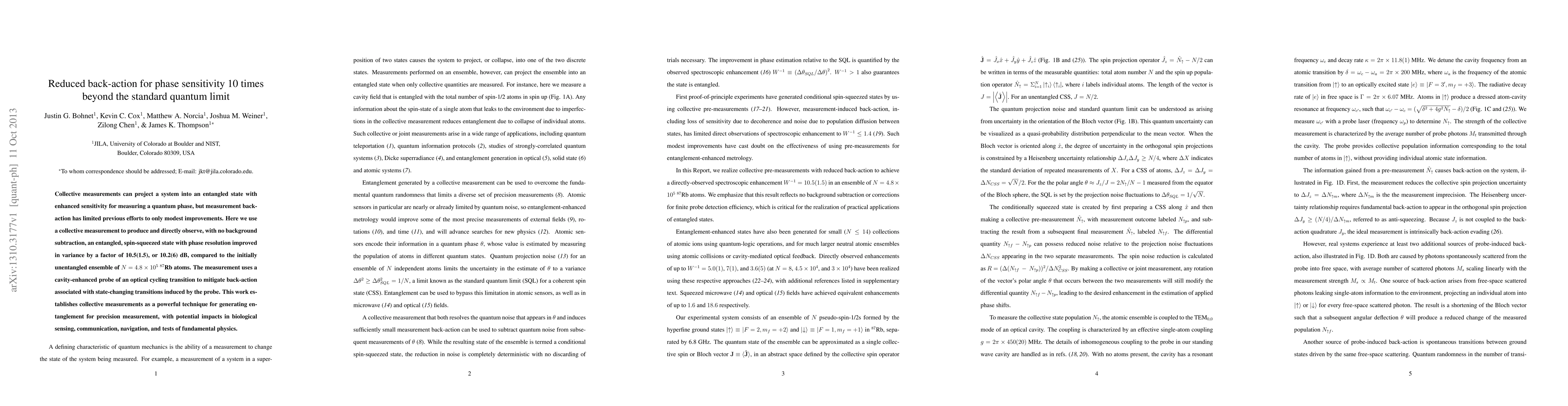 Collective measurements can project a system into an entangled state with enhanced sensitivity for measuring a quantum phase, but measurement back-action has limited previous efforts to only modest improvements. Here we use a collective measurement to produce and directly observe, with no background subtraction, an entangled, spin-squeezed state with phase resolution improved in variance by a factor of 10.5(1.5), or 10.2(6) dB, compared to the initially unentangled ensemble of N = 4.8 x 10^5 87Rb atoms. The measurement uses a cavity-enhanced probe of an optical cycling transition to mitigate back-action associated with state-changing transitions induced by the probe. This work establishes collective measurements as a powerful technique for generating entanglement for precision measurement, with potential impacts in biological sensing, communication, navigation, and tests of fundamental physics.