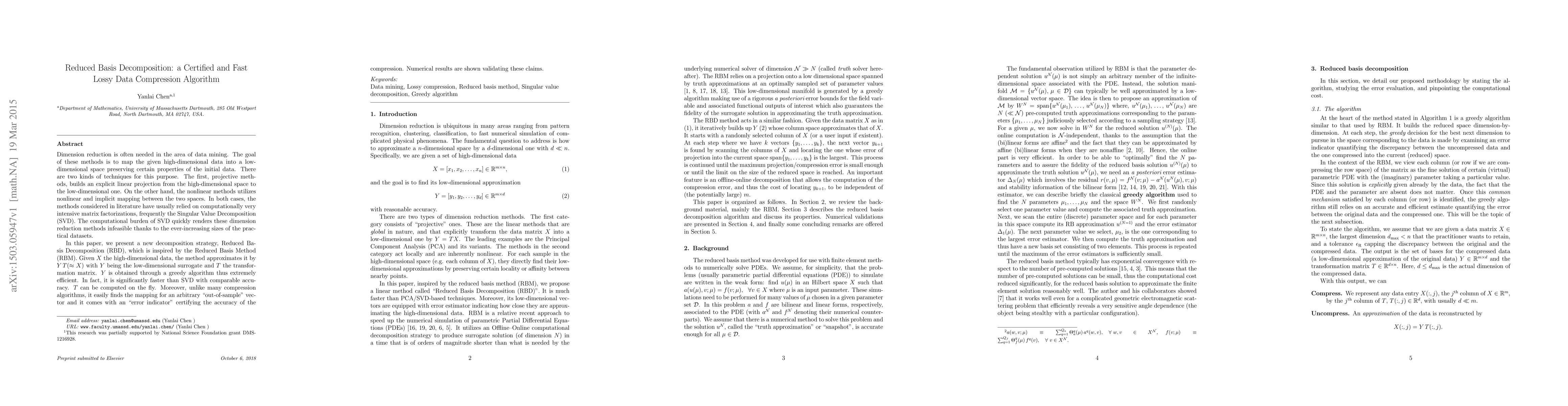 Dimension reduction is often needed in the area of data mining. The goal of these methods is to map the given high-dimensional data into a low-dimensional space preserving certain properties of the initial data. There are two kinds of techniques for this purpose. The first, projective methods, builds an explicit linear projection from the high-dimensional space to the low-dimensional one. On the other hand, the nonlinear methods utilizes nonlinear and implicit mapping between the two spaces. In both cases, the methods considered in literature have usually relied on computationally very intensive matrix factorizations, frequently the Singular Value Decomposition (SVD). The computational burden of SVD quickly renders these dimension reduction methods infeasible thanks to the ever-increasing sizes of the practical datasets. In this paper, we present a new decomposition strategy, Reduced Basis Decomposition (RBD), which is inspired by the Reduced Basis Method (RBM). Given $X$ the high-dimensional data, the method approximates it by $Y \, T (\approx X)$ with $Y$ being the low-dimensional surrogate and $T$ the transformation matrix. $Y$ is obtained through a greedy algorithm thus extremely efficient. In fact, it is significantly faster than SVD with comparable accuracy. $T$ can be computed on the fly. Moreover, unlike many compression algorithms, it easily finds the mapping for an arbitrary ``out-of-sample'' vector and it comes with an ``error indicator'' certifying the accuracy of the compression. Numerical results are shown validating these claims.