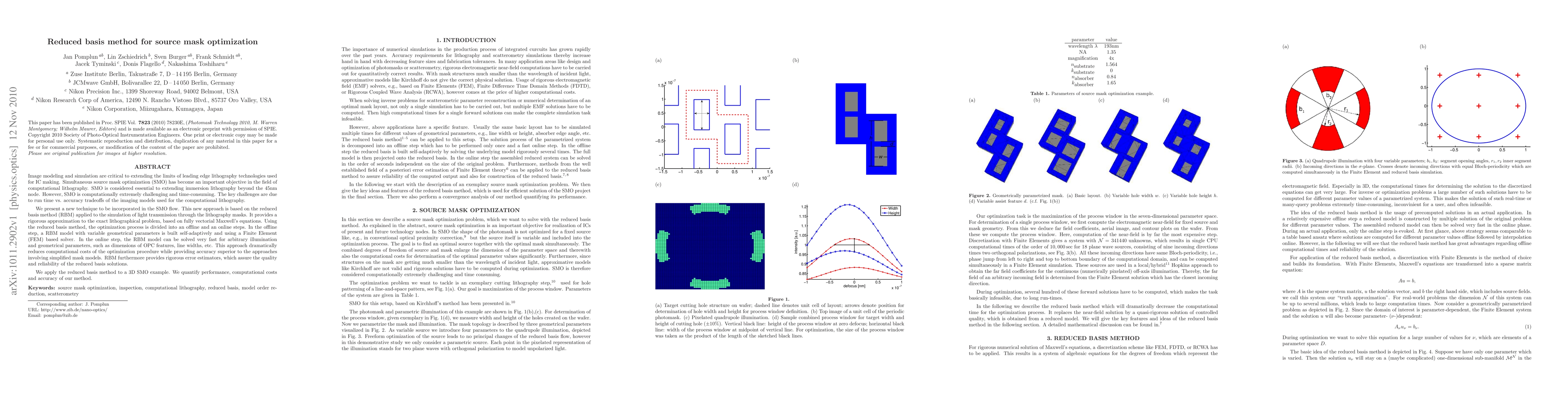 The paper proposes a reduced basis method (RBM) for optimizing source mask optimization (SMO) in computational lithography, significantly reducing computational costs while maintaining high accuracy by dividing the optimization into offline and online steps. The method provides rigorous error estimators and outperforms simplified models.