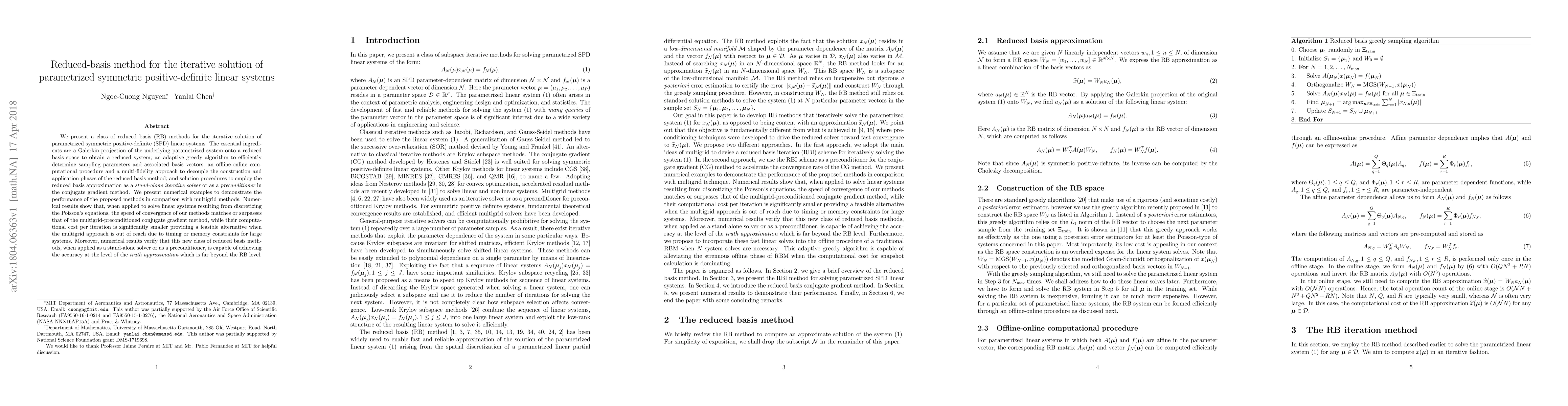 This paper introduces a reduced basis method for solving parametrized symmetric positive-definite linear systems, employing a Galerkin projection and adaptive greedy algorithm. It demonstrates competitive convergence speed and lower computational cost compared to multigrid methods, showing effectiveness as a stand-alone solver or preconditioner for large systems.