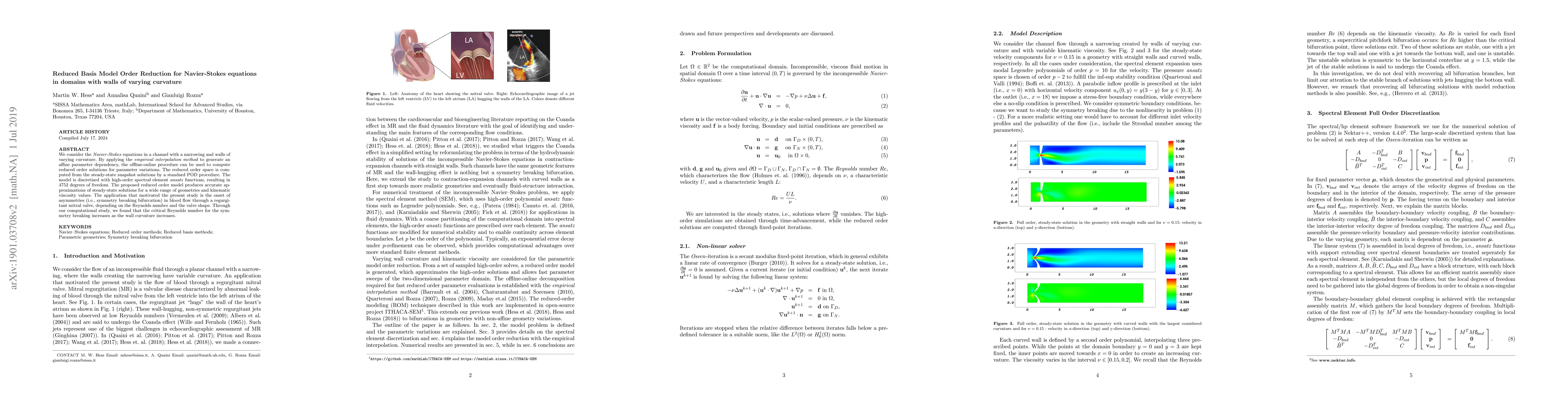 This paper proposes a reduced basis model for solving the Navier-Stokes equations in channels with varying wall curvatures, employing the empirical interpolation method and high-order spectral elements. The model accurately approximates steady-state solutions, with applications to understanding blood flow asymmetries in mitral valve regurgitation, showing that increased wall curvature raises the critical Reynolds number for symmetry breaking.