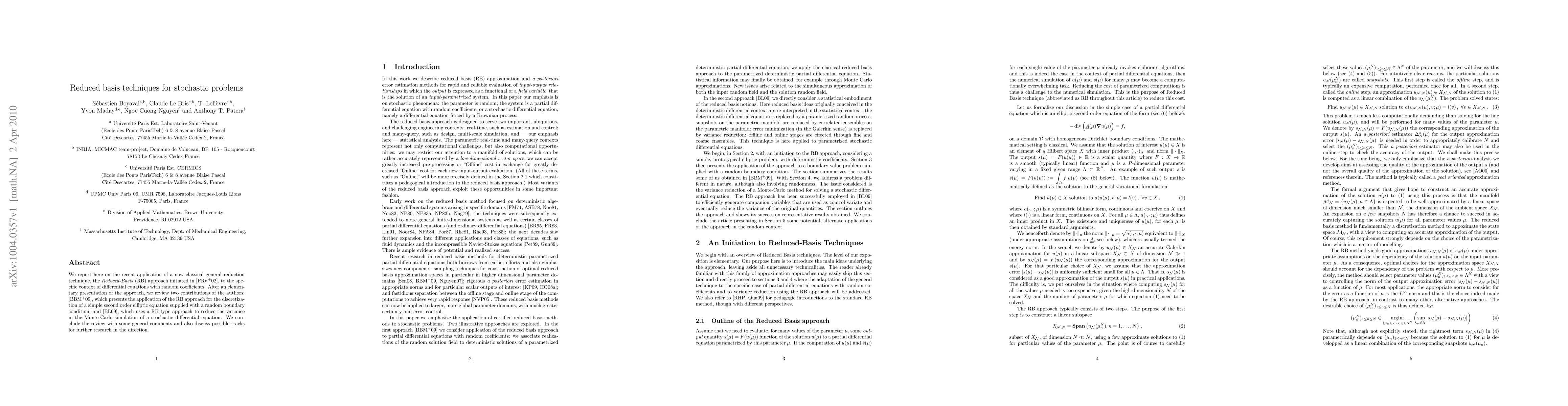 This paper reviews the application of Reduced-Basis techniques to stochastic differential equations with random coefficients, highlighting two key contributions: one for discretizing elliptic equations with random boundary conditions and another for variance reduction in stochastic differential equations. The authors discuss potential future research directions.