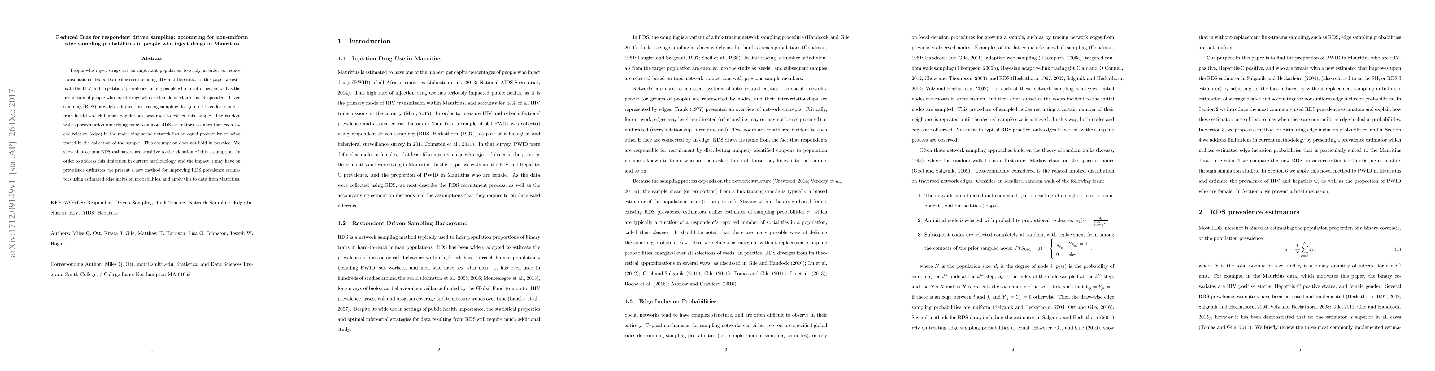 This paper proposes a new method to improve respondent driven sampling (RDS) estimates by accounting for non-uniform edge sampling probabilities, particularly for people who inject drugs in Mauritius. It aims to enhance the accuracy of HIV and Hepatitis C prevalence estimates and the proportion of female drug injectors by addressing the assumption of uniform edge sampling in RDS.