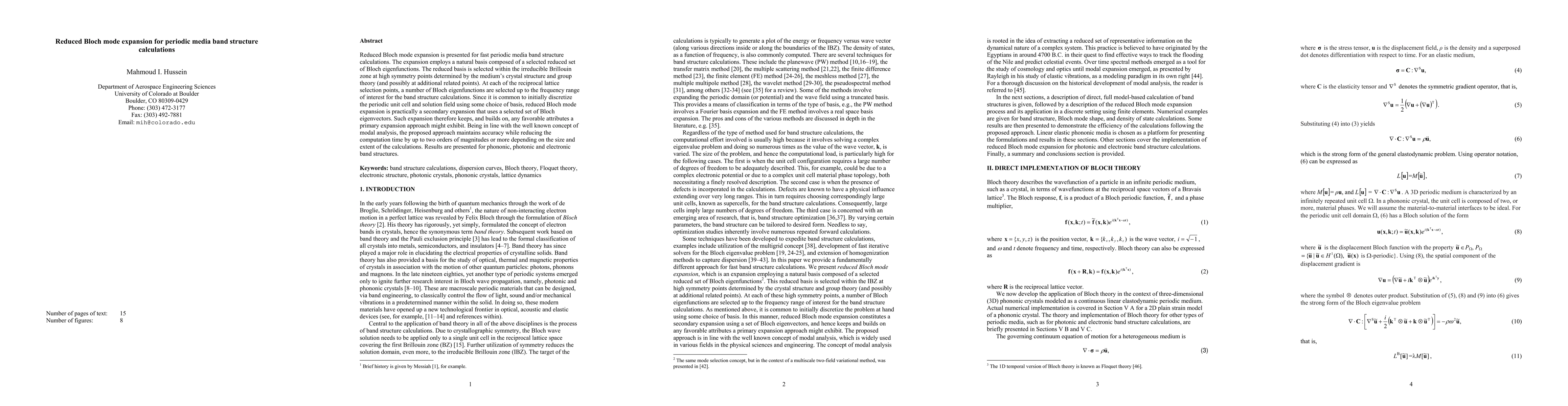This paper proposes a reduced Bloch mode expansion method for efficient calculations of periodic media band structures, employing a selected basis of Bloch eigenfunctions to achieve accuracy while significantly reducing computation time, demonstrating applications in phononic, photonic, and electronic band structures.