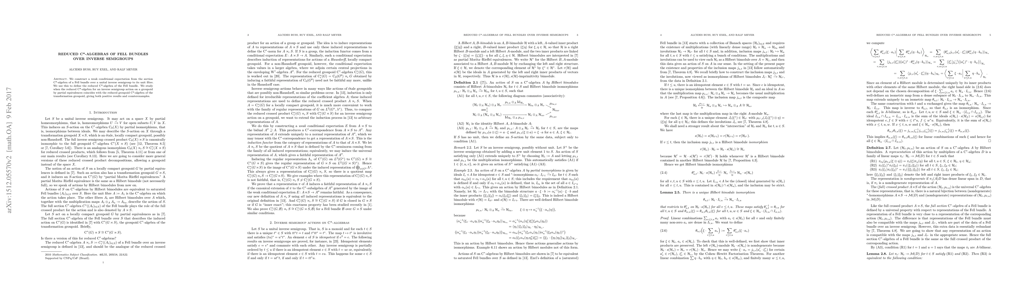 We construct a weak conditional expectation from the section C*-algebra of a Fell bundle over a unital inverse semigroup to its unit fibre. We use this to define the reduced C*-algebra of the Fell bundle. We study when the reduced C*-algebra for an inverse semigroup action on a groupoid by partial equivalences coincides with the reduced groupoid C*-algebra of the transformation groupoid, giving both positive results and counterexamples.