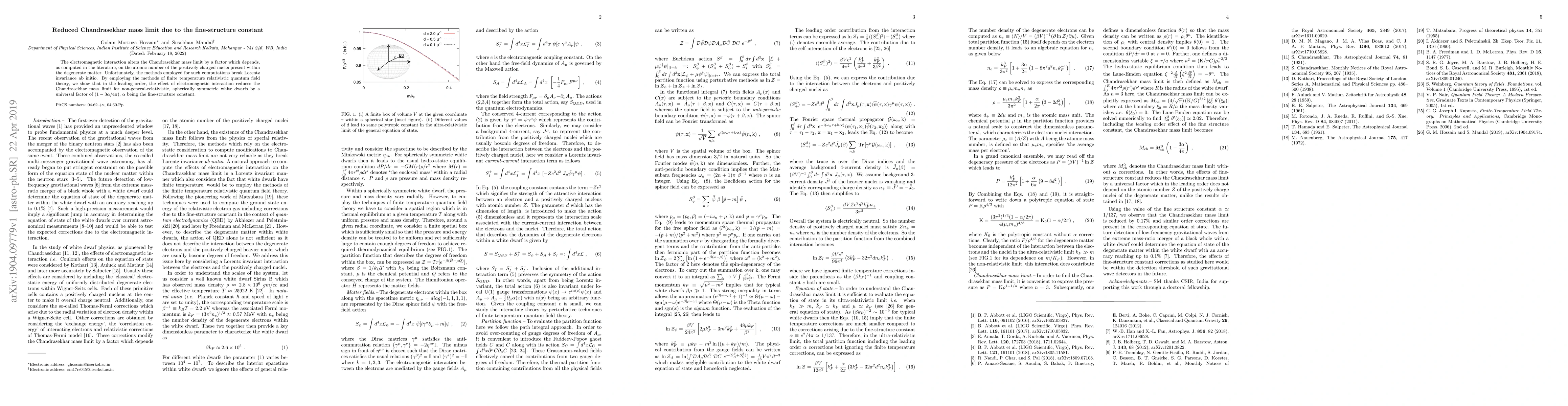 Researchers found that electromagnetic interactions reduce the Chandrasekhar mass limit for white dwarfs by a factor of $(1-3rac{ ext{fine structure constant}}{4 ext{π}})$.