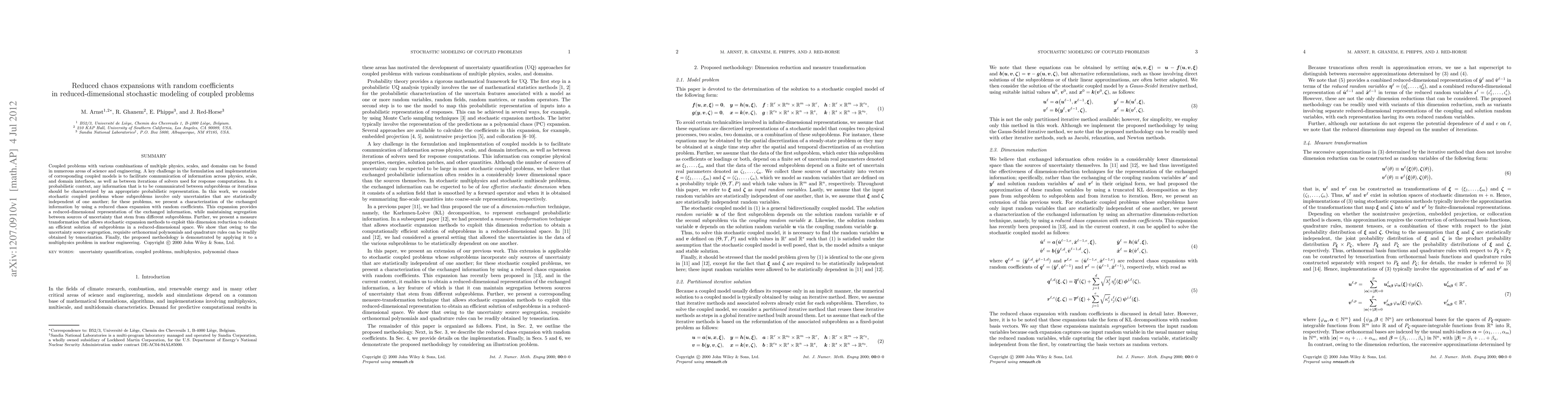 Coupled problems with various combinations of multiple physics, scales, and domains can be found in numerous areas of science and engineering. A key challenge in the formulation and implementation of corresponding coupled models is to facilitate communication of information across physics, scale, and domain interfaces, as well as between iterations of solvers used for response computations. In a probabilistic context, any information that is to be communicated between subproblems or iterations should be characterized by an appropriate probabilistic representation. In this work, we consider stochastic coupled problems whose subproblems involve only uncertainties that are statistically independent of one another; for these problems, we present a characterization of the exchanged information by using a reduced chaos expansion with random coefficients. This expansion provides a reduced-dimensional representation of the exchanged information, while maintaining segregation between sources of uncertainty that stem from different subproblems. Further, we present a measure transformation that allows stochastic expansion methods to exploit this dimension reduction to obtain an efficient solution of subproblems in a reduced-dimensional space. We show that owing to the uncertainty source segregation, requisite orthonormal polynomials and quadrature rules can be readily obtained by tensorization. Finally, the proposed methodology is demonstrated by applying it to a multiphysics problem in nuclear engineering.