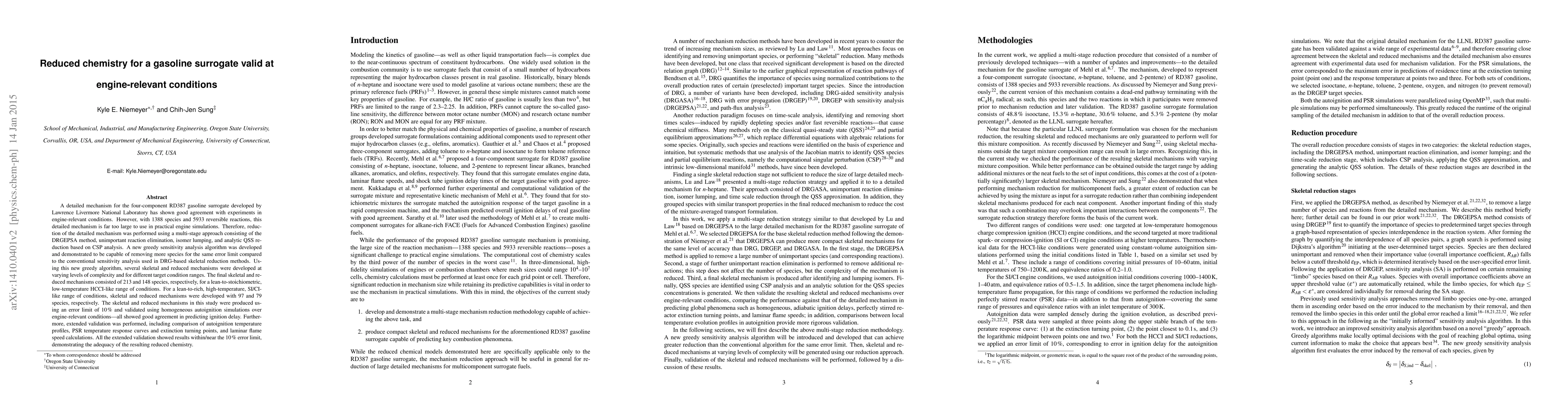 A detailed mechanism for the four-component RD387 gasoline surrogate developed by Lawrence Livermore National Laboratory has shown good agreement with experiments in engine-relevant conditions. However, with 1388 species and 5933 reversible reactions, this detailed mechanism is far too large to use in practical engine simulations. Therefore, reduction of the detailed mechanism was performed using a multi-stage approach consisting of the DRGEPSA method, unimportant reaction elimination, isomer lumping, and analytic QSS reduction based on CSP analysis. A new greedy sensitivity analysis algorithm was developed and demonstrated to be capable of removing more species for the same error limit compared to the conventional sensitivity analysis used in DRG-based skeletal reduction methods. Using this new greedy algorithm, several skeletal and reduced mechanisms were developed at varying levels of complexity and for different target condition ranges. The final skeletal and reduced mechanisms consisted of 213 and 148 species, respectively, for a lean-to-stoichiometric, low-temperature HCCI-like range of conditions. For a lean-to-rich, high-temperature, SI/CI-like range of conditions, skeletal and reduced mechanisms were developed with 97 and 79 species, respectively. The skeletal and reduced mechanisms in this study were produced using an error limit of 10% and validated using homogeneous autoignition simulations over engine-relevant conditions - all showed good agreement in predicting ignition delay. Furthermore, extended validation was performed, including comparison of autoignition temperature profiles, PSR temperature response curves and extinction turning points, and laminar flame speed calculations. All the extended validation showed results within the 10% error limit, demonstrating the adequacy of the resulting reduced chemistry.