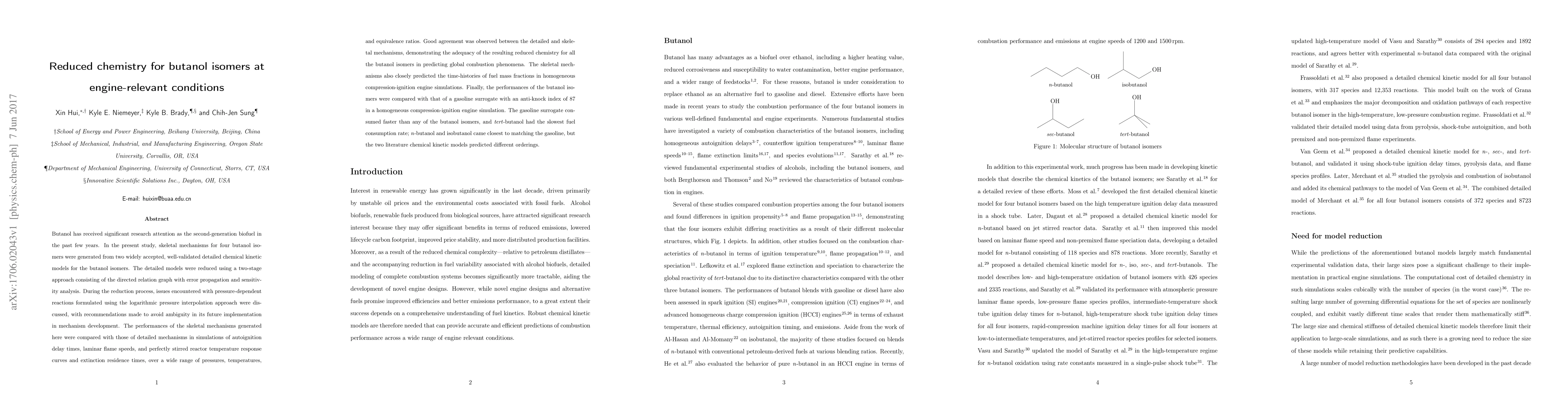 Butanol has received significant research attention as a second-generation biofuel in the past few years. In the present study, skeletal mechanisms for four butanol isomers were generated from two widely accepted, well-validated detailed chemical kinetic models for the butanol isomers. The detailed models were reduced using a two-stage approach consisting of the directed relation graph with error propagation and sensitivity analysis. During the reduction process, issues were encountered with pressure-dependent reactions formulated using the logarithmic pressure interpolation approach; these issues are discussed and recommendations made to avoid ambiguity in its future implementation in mechanism development. The performance of the skeletal mechanisms generated here was compared with that of detailed mechanisms in simulations of autoignition delay times, laminar flame speeds, and perfectly stirred reactor temperature response curves and extinction residence times, over a wide range of pressures, temperatures, and equivalence ratios. The detailed and skeletal mechanisms agreed well, demonstrating the adequacy of the resulting reduced chemistry for all the butanol isomers in predicting global combustion phenomena. In addition, the skeletal mechanisms closely predicted the time-histories of fuel mass fractions in homogeneous compression-ignition engine simulations. The performance of each butanol isomer was additionally compared with that of a gasoline surrogate with an antiknock index of 87 in a homogeneous compression-ignition engine simulation. The gasoline surrogate was consumed faster than any of the butanol isomers, with tert-butanol exhibiting the slowest fuel consumption rate. While n-butanol and isobutanol displayed the most similar consumption profiles relative to the gasoline surrogate, the two literature chemical kinetic models predicted different orderings.