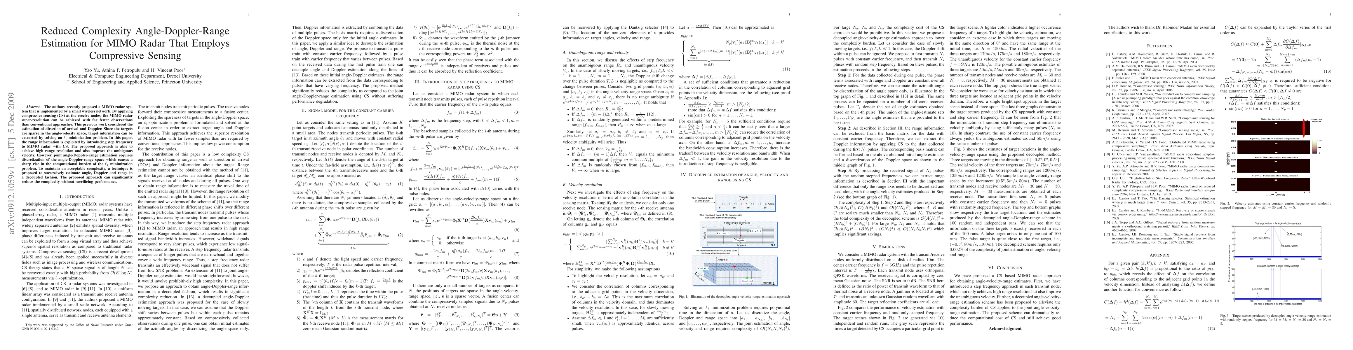This paper proposes a reduced complexity method for angle-Doppler-range estimation in MIMO radar using compressive sensing and step frequency techniques. It introduces a decoupled estimation approach to manage the computational burden while maintaining high resolution and performance.