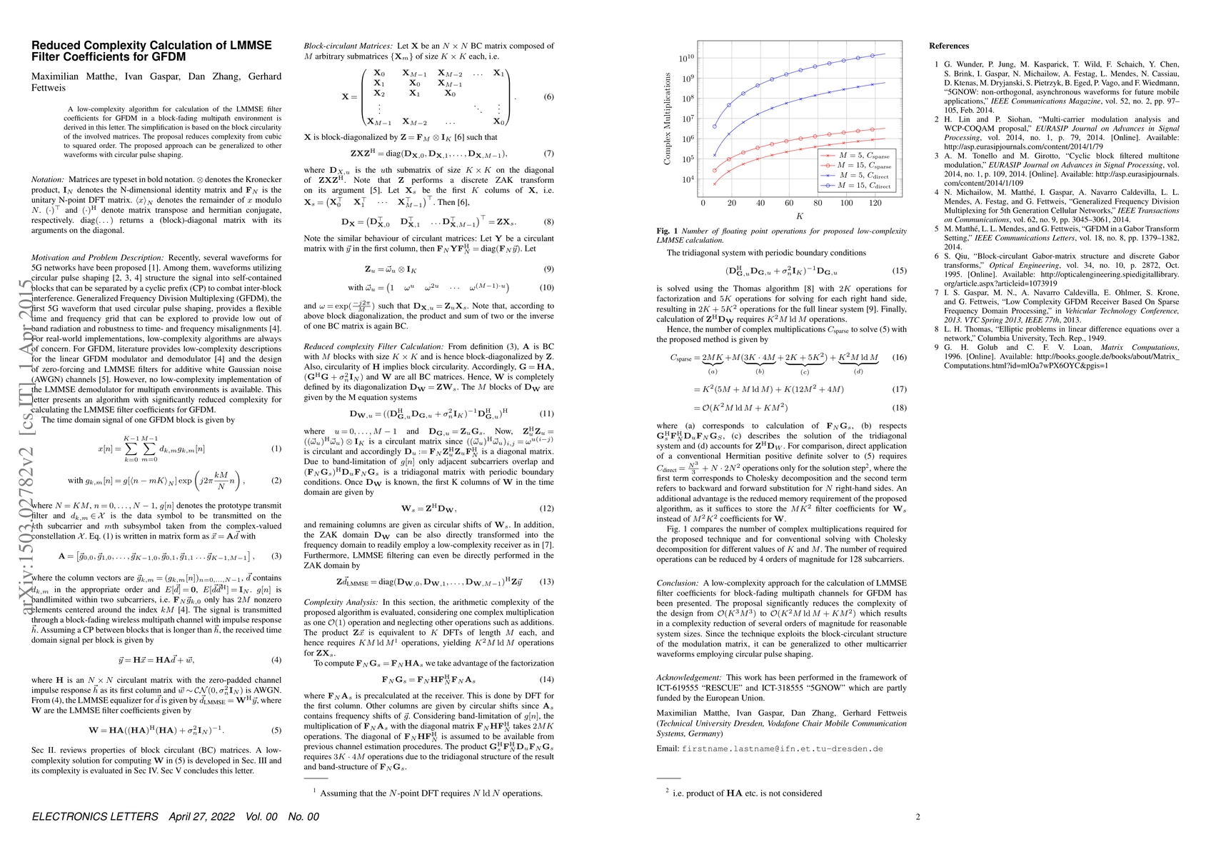 A low-complexity algorithm for calculation of the LMMSE filter coefficients for GFDM in a block-fading multipath environment is derived in this letter. The simplification is based on the block circularity of the involved matrices. The proposal reduces complexity from cubic to squared order. The proposed approach can be generalized to other waveforms with circular pulse shaping.