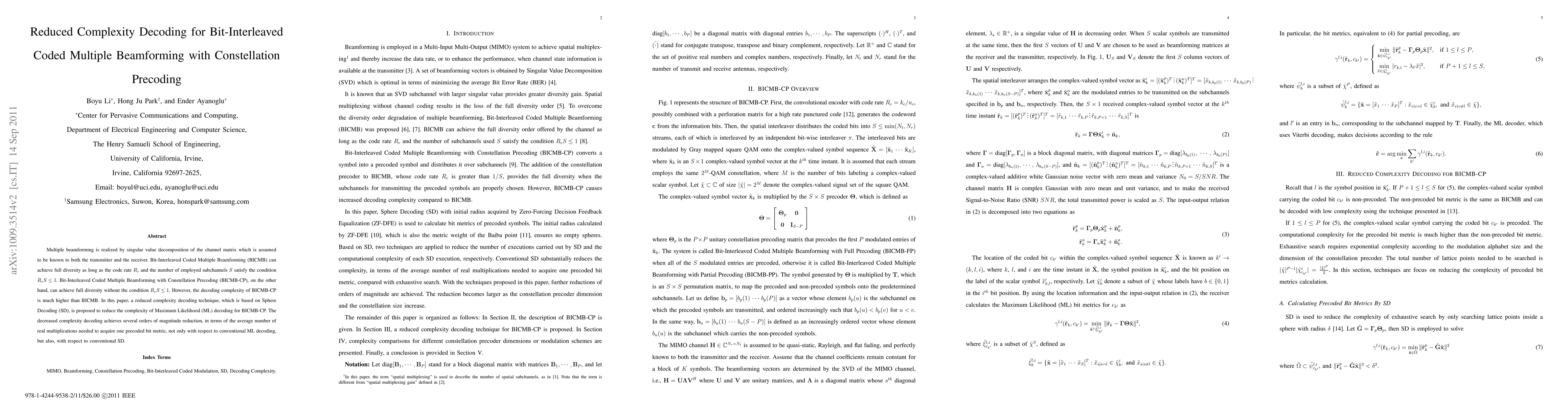 This paper proposes a reduced complexity decoding technique based on Sphere Decoding to lower the complexity of Maximum Likelihood decoding for Bit-Interleaved Coded Multiple Beamforming with Constellation Precoding, achieving several orders of magnitude reduction in computational effort compared to conventional methods.