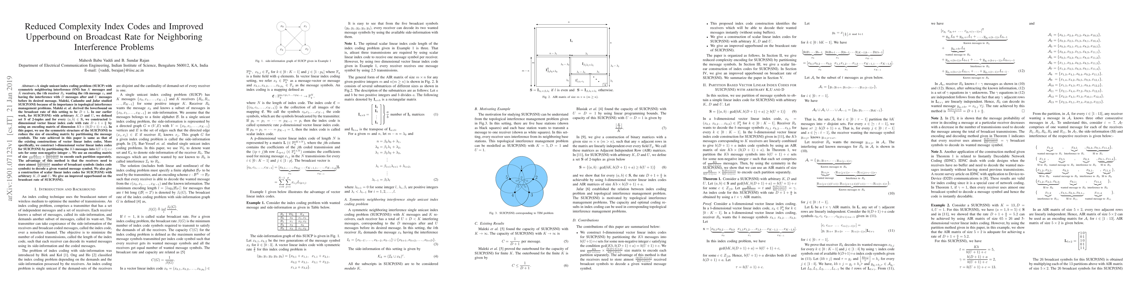 A single unicast index coding problem (SUICP) with symmetric neighboring interference (SNI) has $K$ messages and $K$ receivers, the $k$th receiver $R_{k}$ wanting the $k$th message $x_{k}$ and having the interference with $D$ messages after and $U$ messages before its desired message. Maleki, Cadambe and Jafar studied SUICP(SNI) because of its importance in topological interference management problems. Maleki \textit{et. al.} derived the lowerbound on the broadcast rate of this setting to be $D+1$. In our earlier work, for SUICP(SNI) with arbitrary $K,D$ and $U$, we defined set $\mathbf{S}$ of 2-tuples and for every $(a,b) \in \mathbf{S}$, we constructed $b$-dimensional vector linear index code with rate $D+1+\frac{a}{b}$ by using an encoding matrix of dimension $Kb \times (b(D+1)+a)$. In this paper, we use the symmetric structure of the SUICP(SNI) to reduce the size of encoding matrix by partitioning the message symbols. The rate achieved in this paper is same as that of the existing constructions of vector linear index codes. More specifically, we construct $b$-dimensional vector linear index codes for SUICP(SNI) by partitioning the $Kb$ messages into $b(U+1)+c$ sets for some non-negative integer $c$. We use an encoding matrix of size $\frac{Kb}{b(U+1)+c} \times \frac{b(D+1)+a}{b(U+1)+c}$ to encode each partition separately. The advantage of this method is that the receivers need to store atmost $\frac{b(D+1)+a}{b(U+1)+c}$ number of broadcast symbols (index code symbols) to decode a given wanted message symbol. We also give a construction of scalar linear index codes for SUICP(SNI) with arbitrary $K,D$ and $U$. We give an improved upperbound on the braodcast rate of SUICP(SNI).