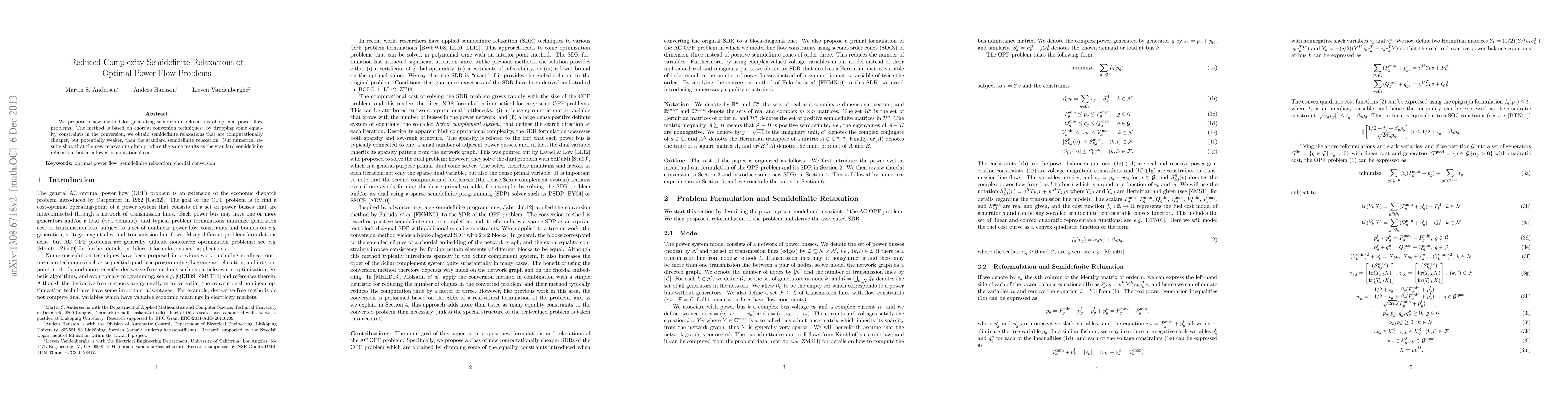 This paper introduces a reduced-complexity method for semidefinite relaxations of optimal power flow problems using chordal conversion techniques, achieving lower computational costs while often maintaining solution accuracy compared to standard methods. Numerical results demonstrate comparable results with reduced computational expense.