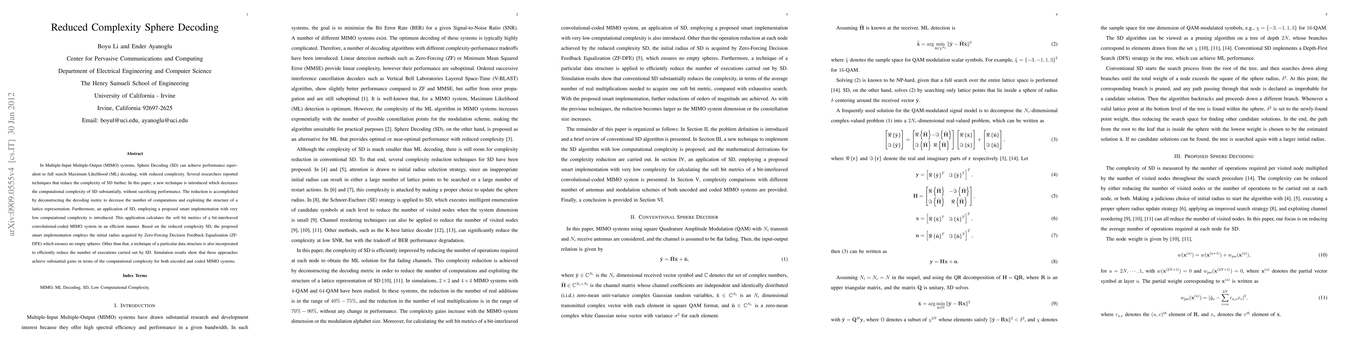 In Multiple-Input Multiple-Output (MIMO) systems, Sphere Decoding (SD) can achieve performance equivalent to full search Maximum Likelihood (ML) decoding, with reduced complexity. Several researchers reported techniques that reduce the complexity of SD further. In this paper, a new technique is introduced which decreases the computational complexity of SD substantially, without sacrificing performance. The reduction is accomplished by deconstructing the decoding metric to decrease the number of computations and exploiting the structure of a lattice representation. Furthermore, an application of SD, employing a proposed smart implementation with very low computational complexity is introduced. This application calculates the soft bit metrics of a bit-interleaved convolutional-coded MIMO system in an efficient manner. Based on the reduced complexity SD, the proposed smart implementation employs the initial radius acquired by Zero-Forcing Decision Feedback Equalization (ZF-DFE) which ensures no empty spheres. Other than that, a technique of a particular data structure is also incorporated to efficiently reduce the number of executions carried out by SD. Simulation results show that these approaches achieve substantial gains in terms of the computational complexity for both uncoded and coded MIMO systems.