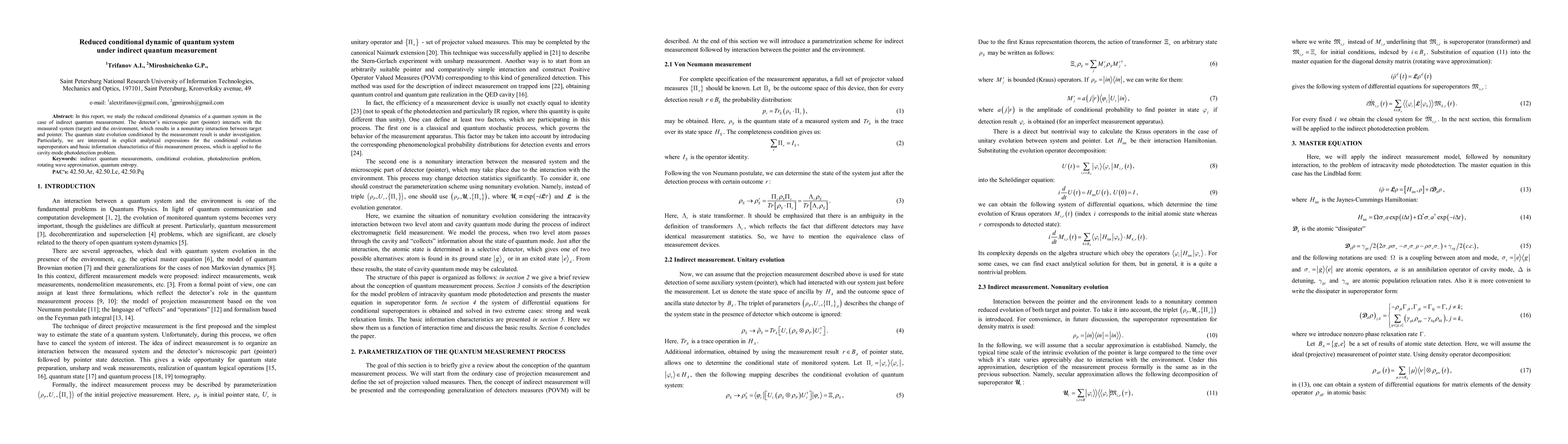 In this report, we study the reduced conditional dynamics of a quantum system in the case of indirect quantum measurement. The detectors microscopic part (pointer) interacts with the measured system (target) and the environment, which results in a nonunitary interaction between target and pointer. The quantum state evolution conditioned by the measurement result is under investigation. Particularly, we are interested in explicit analytical expressions for the conditional evolution superoperators and basic information characteristics of this measurement process, which is applied to the cavity mode photodetection problem.