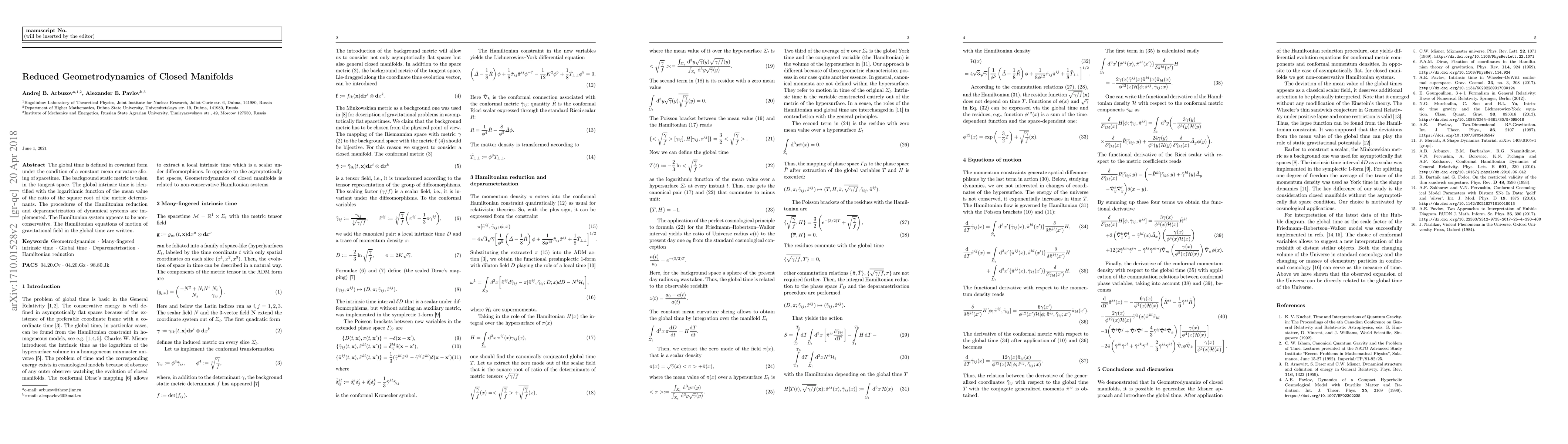 The global time is defined in covariant form under the condition of a constant mean curvature slicing of spacetime. The background static metric is taken in the tangent space. The global intrinsic time is identified with the logarithmic function of the mean value of the ratio of the square root of the metric determinants. The procedures of the Hamiltonian reduction and deparametrization of dynamical systems are implemented. The Hamiltonian system appears to be non-conservative. The Hamiltonian equations of motion of gravitational field in the global time are written.