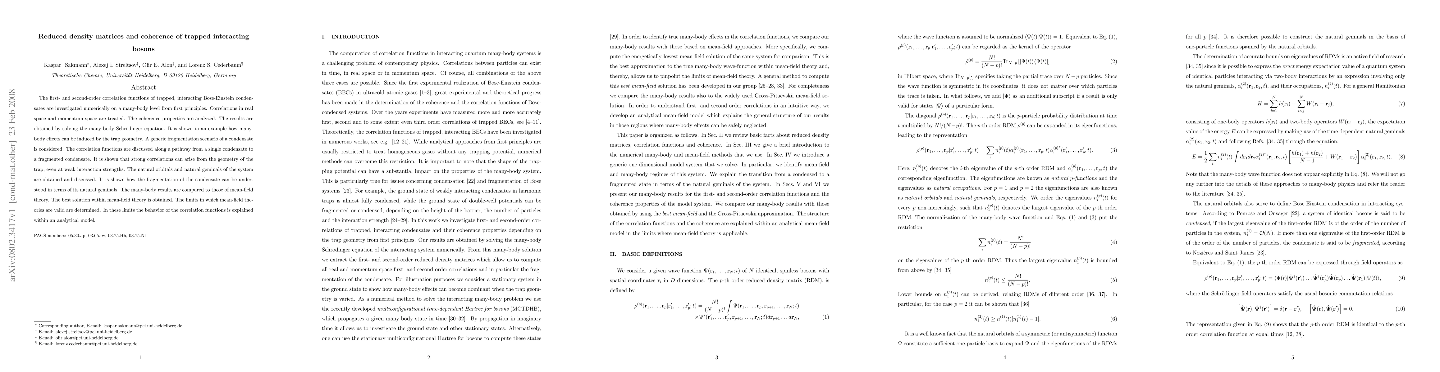 This paper numerically investigates the first- and second-order correlation functions of trapped, interacting Bose-Einstein condensates, revealing how trap geometry induces many-body effects and fragmentation scenarios. It compares many-body results with mean-field theory, determining the limits of mean-field validity and explaining correlation functions analytically.