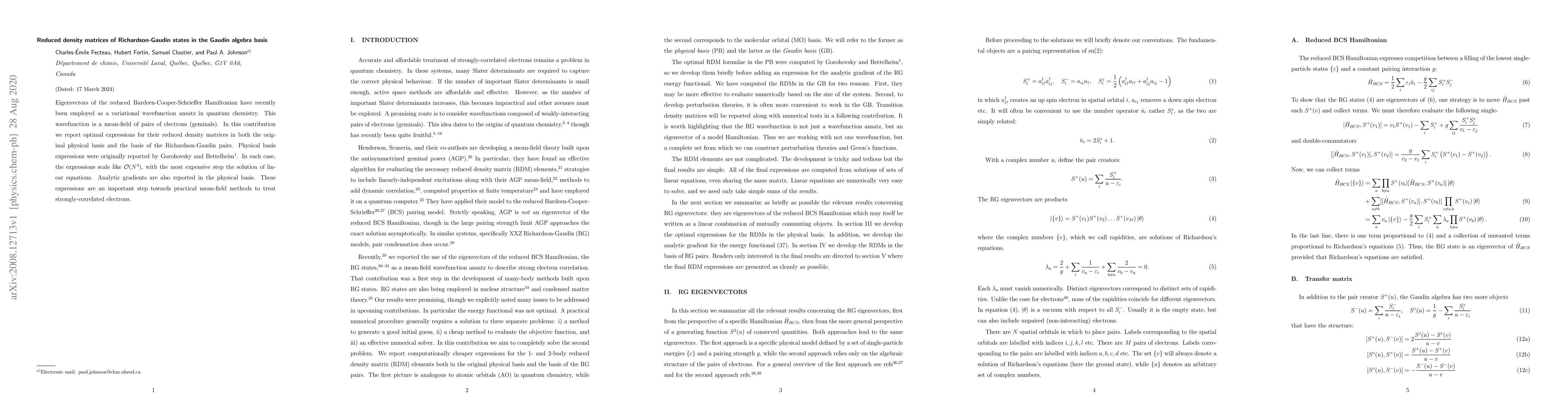 Eigenvectors of the reduced Bardeen-Cooper-Schrieffer Hamiltonian have recently been employed as a variational wavefunction ansatz in quantum chemistry. This wavefunction is a mean-field of pairs of electrons (geminals). In this contribution we report optimal expressions for their reduced density matrices in both the original physical basis and the basis of the Richardson-Gaudin pairs. Physical basis expressions were originally reported by Gorohovsky and Bettelheim. In each case, the expressions scale like $\mathcal{O}(N^4)$, with the most expensive step the solution of linear equations. Analytic gradients are also reported in the physical basis. These expressions are an important step towards practical mean-field methods to treat strongly-correlated electrons.