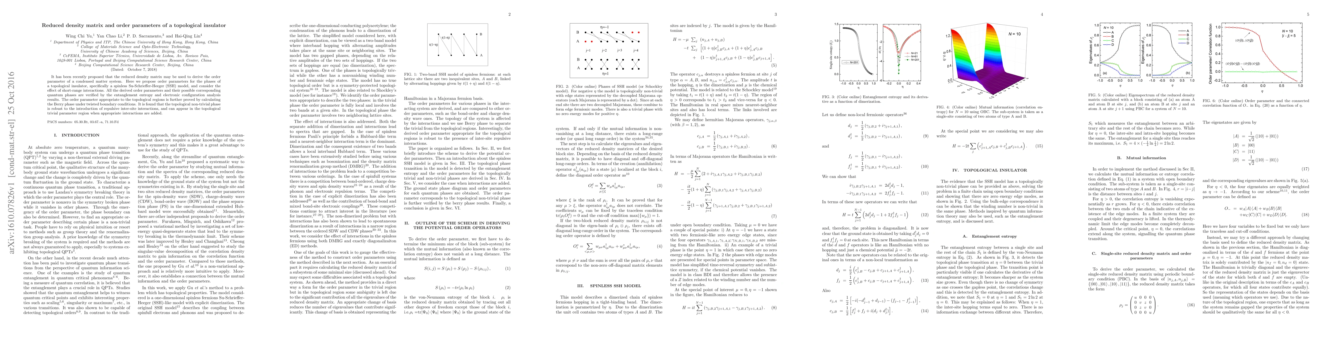 It has been recently proposed that the reduced density matrix may be used to derive the order parameter of a condensed matter system. Here we propose order parameters for the phases of a topological insulator, specifically a spinless Su-Schrieffer-Heeger (SSH) model, and consider the effect of short-range interactions. All the derived order parameters and their possible corresponding quantum phases are verified by the entanglement entropy and electronic configuration analysis results. The order parameter appropriate to the topological regions is further proved by calculating the Berry phase under twisted boundary conditions. It is found that the topological non-trivial phase is robust to the introduction of repulsive inter-site interactions, and can appear in the topological trivial parameter region when appropriate interactions are added.