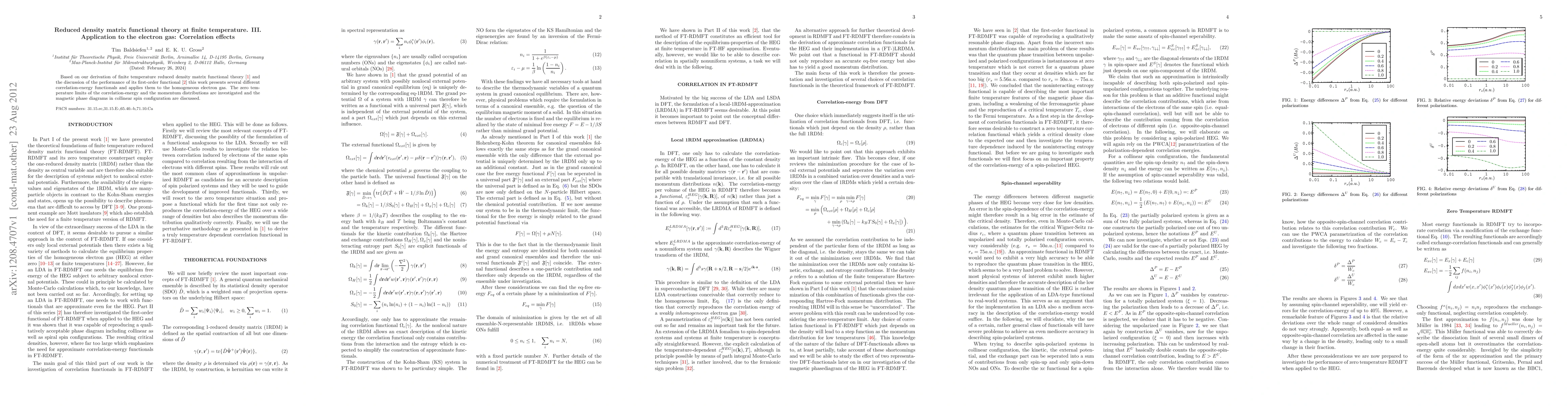 This paper applies finite temperature reduced density matrix functional theory to the homogeneous electron gas, proposing various correlation-energy functionals and exploring their zero-temperature limits and magnetic phase diagrams in a collinear spin configuration. The study highlights correlation effects in the electron gas.