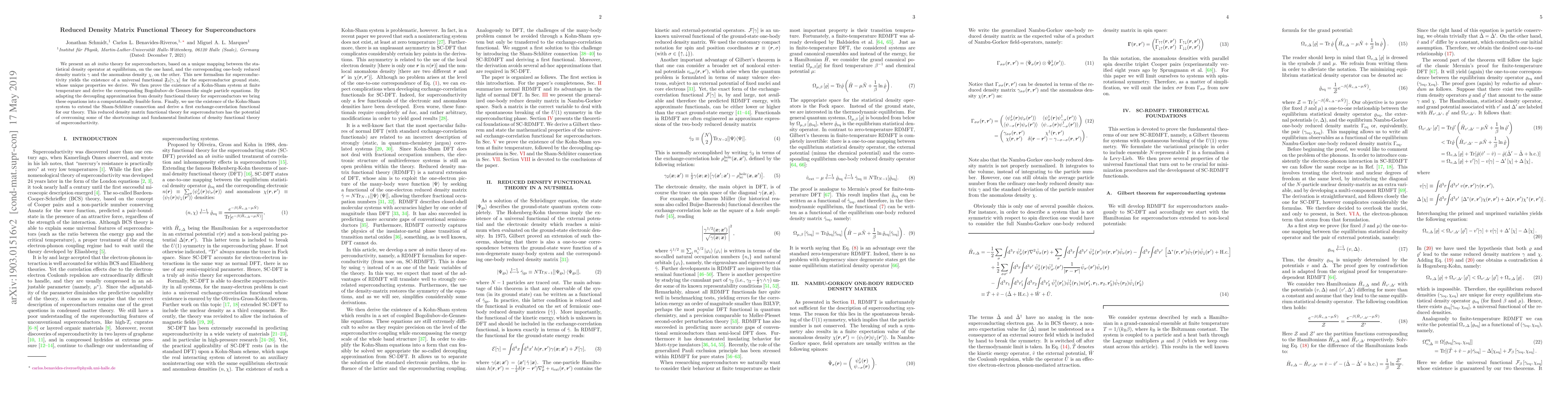 This reduced density matrix functional theory for superconductors has the potential to overcome some of the shortcomings and fundamental limitations of density functional theory of superconductivity.