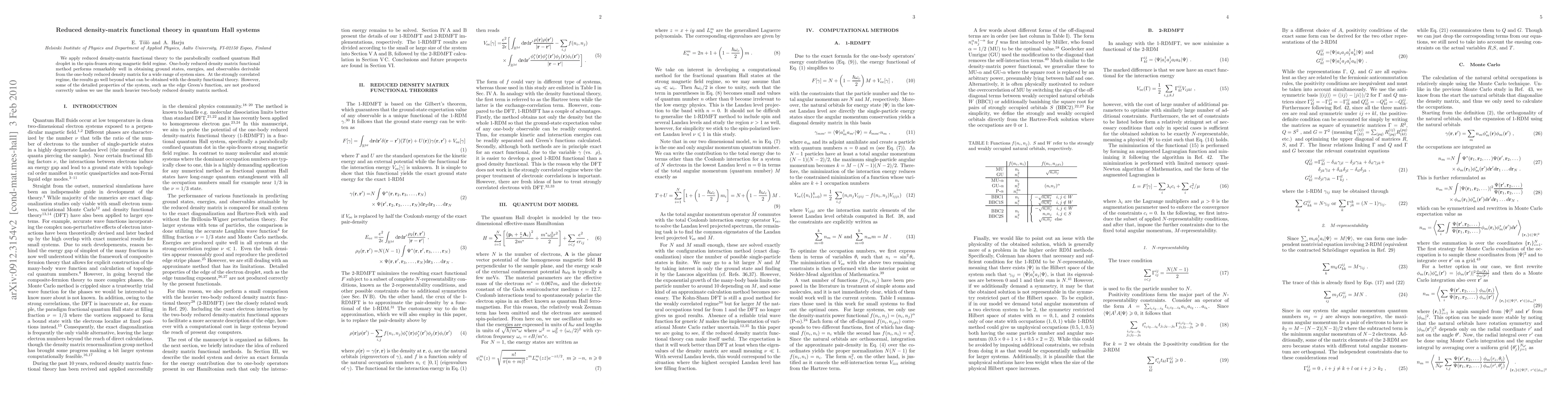 This paper applies reduced density-matrix functional theory to quantum Hall systems, showing it accurately captures ground states and energies. While effective, it falls short for detailed properties like the edge Green's function compared to the more computationally intensive two-body method.