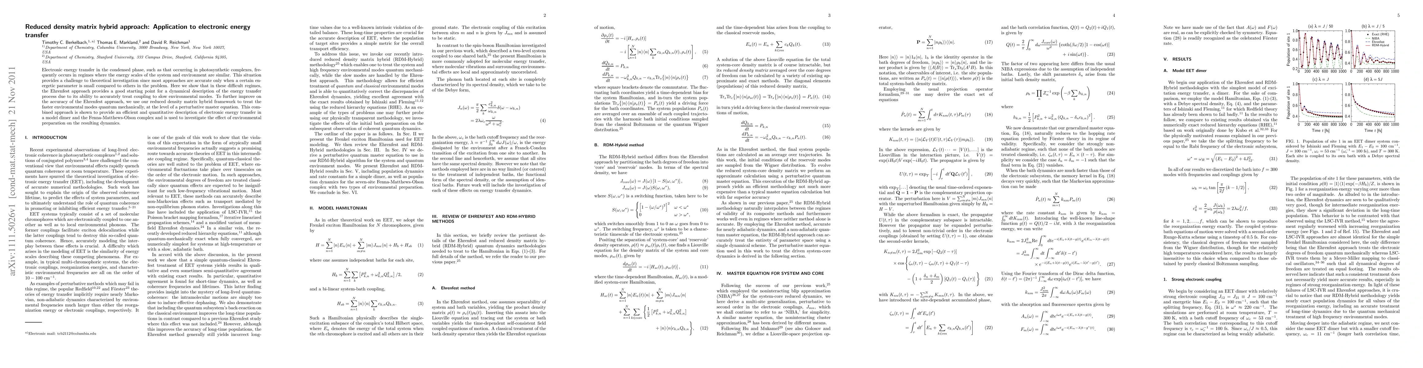The development and application of a reduced density matrix hybrid method that combines the Ehrenfest method with a perturbative master equation for faster environmental modes, providing an efficient and accurate description of EET.