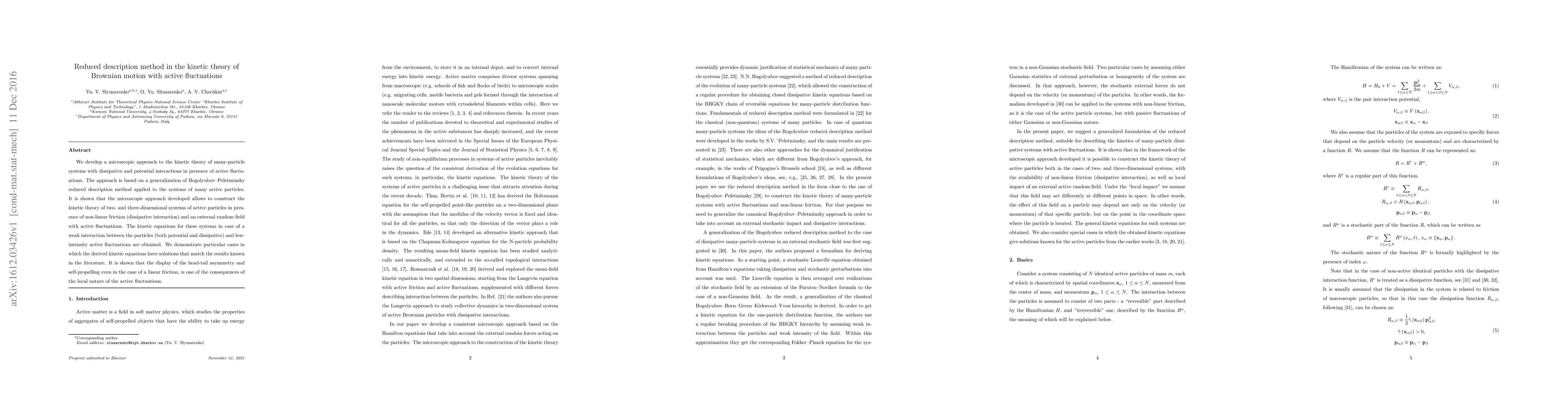 We develop a microscopic approach to the kinetic theory of many-particle systems with dissipative and potential interactions in presence of active fluctuations. The approach is based on a generalization of Bogolyubov--Peletminsky reduced description method applied to the systems of many active particles. It is shown that the microscopic approach developed allows to construct the kinetic theory of two- and three-dimensional systems of active particles in presence of non-linear friction (dissipative interaction) and an external random field with active fluctuations. The kinetic equations for these systems in case of a weak interaction between the particles (both potential and dissipative) and low-intensity active fluctuations are obtained. We demonstrate particular cases in which the derived kinetic equations have solutions that match the results known in the literature. It is shown that the display of the head-tail asymmetry and self-propelling even in the case of a linear friction, is one of the consequences of the local nature of the active fluctuations.