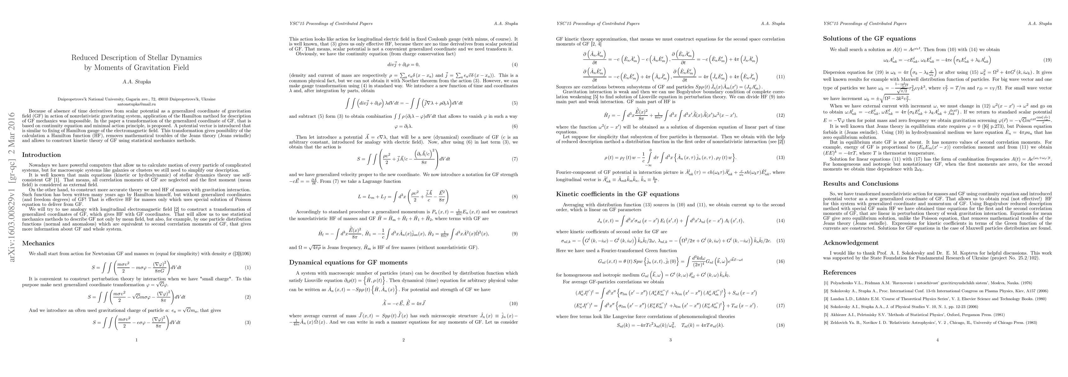 Because of absence of time derivatives from scalar potential as a generalized coordinate of gravitation field (GF) in action of nonrelativistic gravitating system, application of the Hamilton method for description of GF mechanics was impossible. In the paper a transformation of the generalized coordinate of GF, that is based on continuity equation and minimal action principle, is proposed. A potential vector is introduced that is similar to fixing of Hamilton gauge of the electromagnetic field. This transformation gives possibility of the calculation a Hamilton function, removes mathematical troubles of the Jeans theory (Jeans swindle) and allows to construct kinetic theory of GF using statistical mechanics methods.