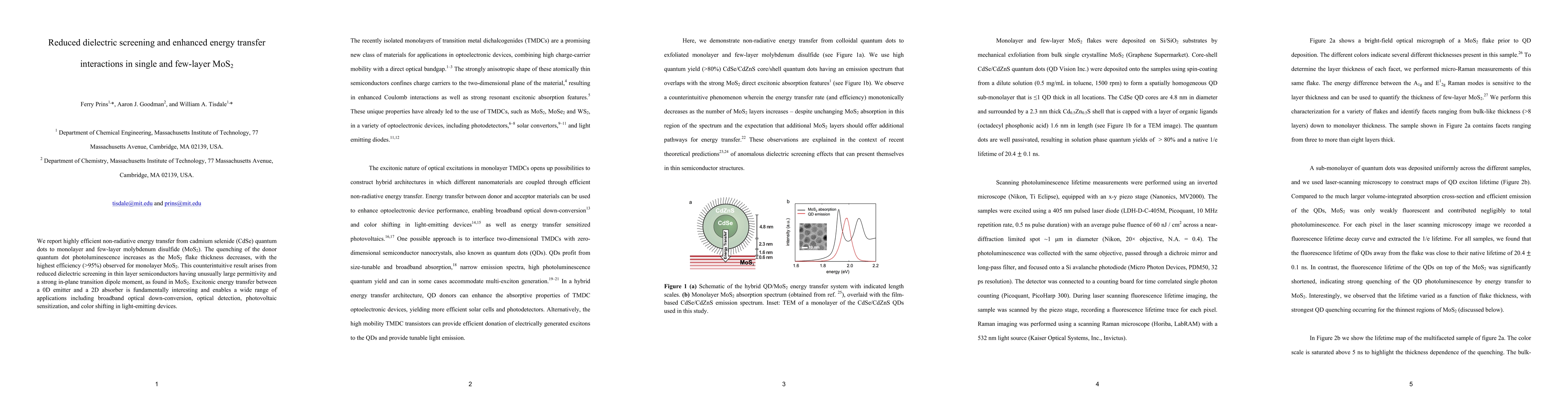 This study demonstrates highly efficient non-radiative energy transfer from CdSe quantum dots to MoS2, with the greatest efficiency (>95%) occurring in monolayer MoS2 due to reduced dielectric screening. Such excitonic energy transfer has significant potential for applications in optical down-conversion, detection, photovoltaics, and light-emitting devices.