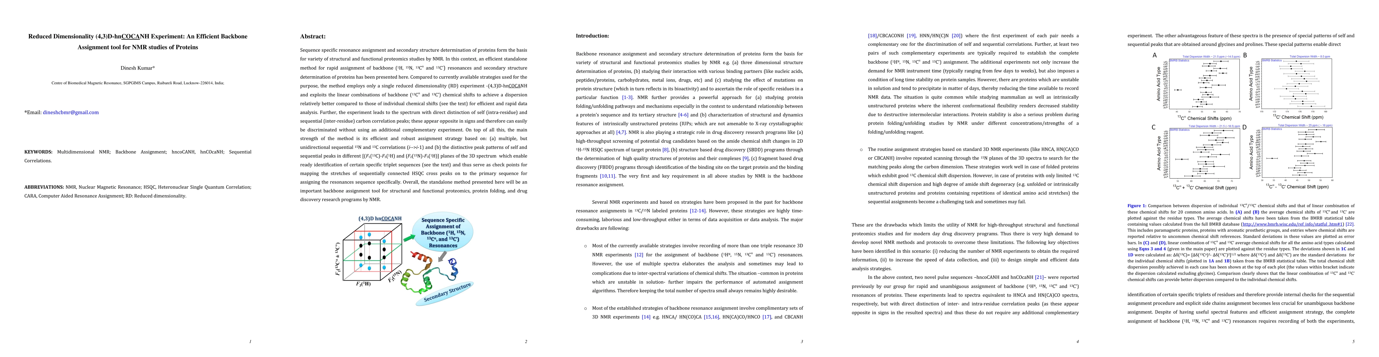 This paper presents a novel (4,3)D-hnCOCANH experiment for rapid backbone resonance assignment and secondary structure determination in proteins via NMR. The method utilizes a single reduced dimensionality experiment that leverages chemical shift combinations for better dispersion and distinct self vs. sequential carbon correlations, enabling efficient and robust resonance assignment without additional experiments.